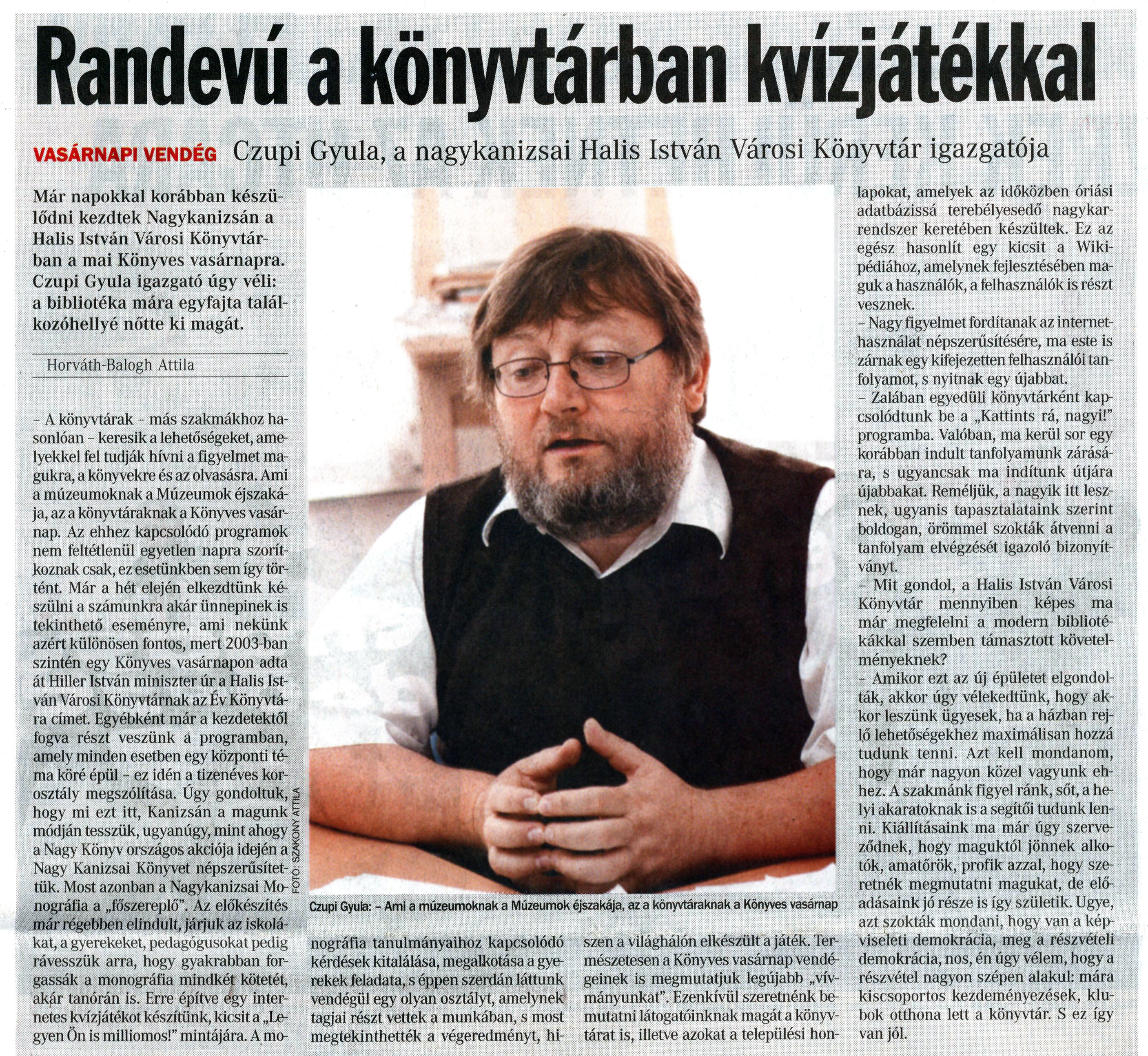 Nyilvános 1135 | 1776 | Vasárnapi Zalai Hírlap 2008. október 12. 041. szám 3. oldal - Randevú a könyvtárban kvízjátékkal | A cikk szövege: Randevú a könyvtárban kvízjátékkal vasárnapi vendég Czupi Gyula, a nagykanizsai Halis István Városi Könyvtár igazgatója Már napokkal korábban készülődni kezdtek Nagykanizsán a Halis István Városi Könyvtárban a mai Könyves vasárnapra. Czupi Gyula igazgató úgy véli: a bibliotéka mára egyfajta találkozóhellyé nőtte ki magát. Horváth-Balogh Attila - A könyvtárak - más szakmákhoz hasonlóan - keresik a lehetőségeket, amelyekkel fel tudják hívni a figyelmet magukra, a könyvekre és az olvasásra. Ami a múzeumoknak a Múzeumok éjszakája, az a könyvtáraknak a Könyves vasárnap. Az ehhez kapcsolódó programok nem feltétlenül egyetlen napra szorítkoznak csak, ez esetünkben sem így történt. Már a hét elején elkezdtünk készülni a számunkra akár ünnepinek is tekinthető eseményre, ami nekünk azért különösen fontos, mert 2003-ban szintén egy Könyves vasárnapon adta át Hiller István miniszter úr a Halis István Városi Könyvtárnak az Év Könyvtára címet. Egyébként már a kezdetektől fogva részt veszünk a programban, amely minden esetben egy központi téma köré épül - ez idén a tizenéves korosztály megszólítása. Úgy gondoltuk, hogy mi ezt itt, Kanizsán a magunk módján tesszük, ugyanúgy, mint ahogy a Nagy Könyv országos akciója idején a Nagy Kanizsai Könyvet népszerűsítettük. Most azonban a Nagykanizsai Monográfia a „főszereplő". Az előkészítés már régebben elindult, járjuk az iskolákat, a gyerekeket, pedagógusokat pedig rávesszük arra, hogy gyakrabban forgassák a monográfia mindkét kötetét, akár tanórán is. Erre építve égy internetes kvízjátékot készítünk, kicsit a „Legyen Ön is milliomos!" mintájára. A mo- Czupi Gyula: - Ami a múzeumoknak a Múzeumok éjszakája, az a könyvtáraknak a Könyves vasárnap nográfia tanulmányaihoz kapcsolódó kérdések kitalálása, megalkotása a gyerekek feladata, s éppen szerdán láttunk vendégül egy olyan osztályt, amelynek tagjai részt vettek a munkában, s most megtekinthették a végeredményt, hi- szen a világhálón elkészült a játék. Természetesen a Könyves vasárnap vendégeinek is megmutatjuk legújabb „vívmányunkat". Ezenkívül szeretnénk bemutatni látogatóinknak magát a könyvtárat is, illetve azokat a települési hon- lapokat, amelyek az időközben óriási adatbázissá terebélyesedő nagykarrendszer keretében készültek. Ez az egész hasonlít egy kicsit a Wikipédiához, amelynek fejlesztésében maguk a használók, a felhasználók is részt vesznek. - Nagy figyelmet fordítanak az internethasználat népszerűsítésére, ma este is zárnak egy kifejezetten felhasználói tanfolyamot, s nyitnak egy újabbat. - Zalában egyedüli könyvtárként kapcsolódtunk be a „Kattints rá, nagyi!" programba. Valóban, ma kerül sor egy korábban indult tanfolyamunk zárására, s ugyancsak ma indítunk útjára újabbakat Reméljük, a nagyik itt lesznek, ugyanis tapasztalataink szerint boldogan, örömmel szokták átvenni a tanfolyam elvégzését igazoló bizonyítványt. - Mit gondol, a Halis István Városi Könyvtár mennyiben képes ma már megfelelni a modern bibliotékákkal szemben támasztott követelményeknek? - Amikor ezt az új épületet elgondolták, akkor úgy vélekedtünk, hogy akkor leszünk ügyesek, ha a házban rejlő lehetőségekhez maximálisan hozzá tudunk tenni. Azt kell mondanom, hogy már nagyon közel vagyunk ehhez. A szakmánk figyel ránk, sőt, a helyi akaratoknak is a segítői tudunk lenni. Kiállításaink ma már úgy szerveződnek, hogy maguktól jönnek alkotók, amatőrök, profik azzal, hogy szeretnék megmutatni magukat, de előadásaink jó része is így születik. Ugye, azt szokták mondani, hogy van a képviseleti demokrácia, meg a részvételi demokrácia, nos, én úgy vélem, hogy a részvétel nagyon szépen alakul: mára kiscsoportos kezdeményezések, klubok otthona lett a könyvtár. S ez így van jól. |
