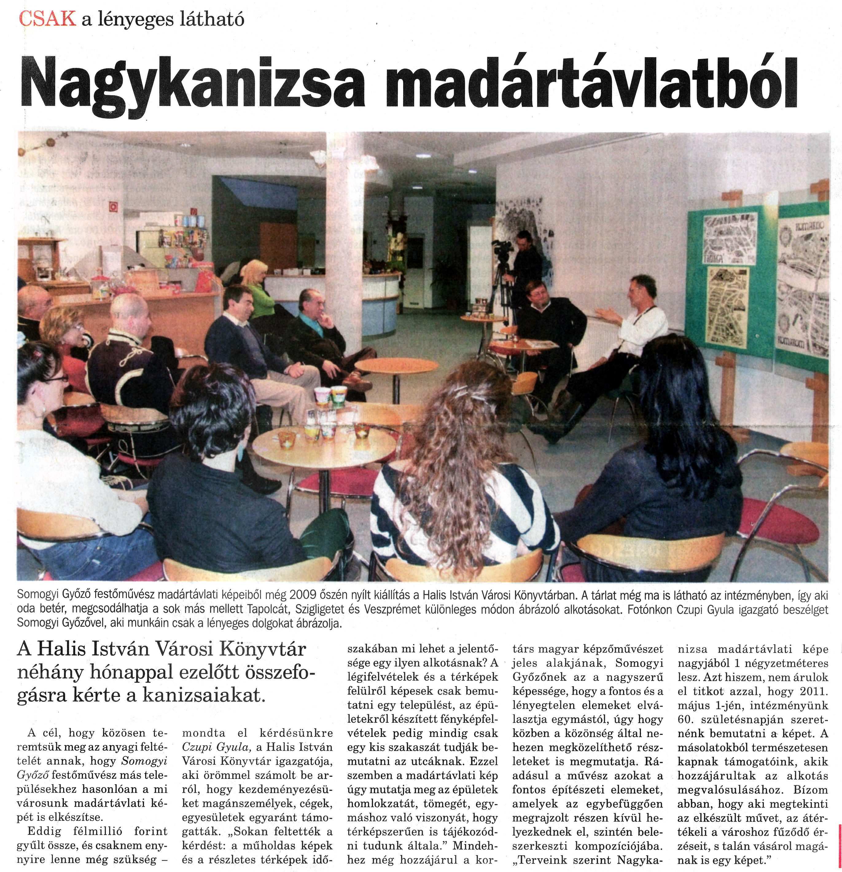 Nyilvános 1191 | 1928 | Nagykanizsai Maraton 2010. március 5. 9. szám 1. oldal - Nagykanizsa madártávlatból | A cikk szövege: CSAK a lényeges látható Nagykanizsa madártávlatból Somogyi Győző festőművész madártávlati képeiből még 2009 őszén nyílt kiállítás a Halis István Városi Könyvtárban. A tárlat még ma is látható az intézményben, így aki oda betér, megcsodálhatja a sok más mellett Tapolcát, Szigligetet és Veszprémet különleges módon ábrázoló alkotásokat. Fotónkon Czupi Gyula igazgató beszélget Somogyi Győzővel, aki munkáin csak a lényeges dolgokat ábrázolja. A Halis István Városi Könyvtár néhány hónappal ezelőtt összefogásra kérte a kanizsaiakat. A cél, hogy közösen teremtsük meg az anyagi feltételét annak, hogy Somogyi Győző festőművész más településekhez hasonlóan a mi városunk madártávlati képét is elkészítse. Eddig félmillió forint gyűlt össze, és csaknem ennyire lenne még szükség - mondta el kérdésünkre Czupi Gyula, a Halis István Városi Könyvtár igazgatója, aki örömmel számolt be arról, hogy kezdeményezésüket magánszemélyek, cégek, egyesületek egyaránt támogatták. „Sokan feltették a kérdést: a műholdas képek és a részletes térképek időszakában mi lehet a jelentősége egy ilyen alkotásnak? A légifelvételek és a térképek felülről képesek csak bemutatni egy települést, az épületekről készített fényképfelvételek pedig mindig csak egy kis szakaszát tudják bemutatni az utcáknak. Ezzel szemben a madártávlati kép úgy mutatja meg az épületek homlokzatát, tömegét, egymáshoz való viszonyát, hogy térképszerűen is tájékozódni tudunk általa." Mindehhez még hozzájárul a kortárs magyar képzőművészet jeles alakjának, Somogyi Győzőnek az a nagyszerű képessége, hogy a fontos és a lényegtelen elemeket elválasztja egymástól, úgy hogy közben a közönség által nehezen megközelíthető részleteket is megmutatja. Ráadásul a művész azokat a fontos építészeti elemeket, amelyek az egybefüggően megrajzolt részen kívül helyezkednek el, szintén beleszerkeszti kompozíciójába. „Terveink szerint Nagykanizsa madártávlati képe nagyjából 1 négyzetméteres lesz. Azt hiszem, nem árulok el titkot azzal, hogy 2011. május 1-jén, intézményünk 60. születésnapján szeretnénk bemutatni a képet. A másolatokból természetesen kapnak támogatóink, akik hozzájárultak az alkotás megvalósulásához. Bízom abban, hogy aki megtekinti az elkészült művet, az átértékeli a városhoz fűződő érzéseit, s talán vásárol magának is egy képet." |