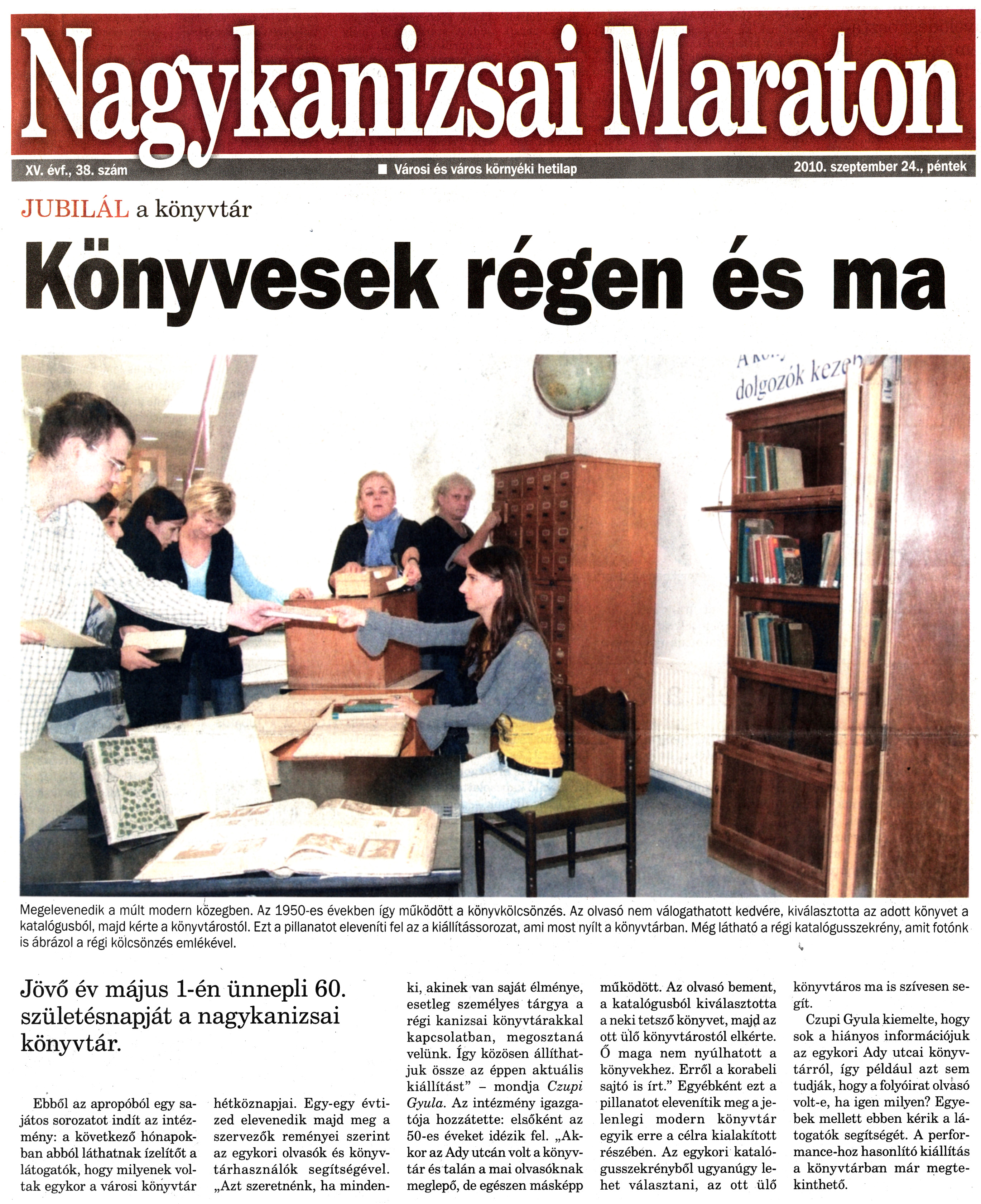 Nyilvános 1232 | 1567 | Nagykanizsai Maraton 2010. szeptember 24. 38. szám 1. oldal - Könyvesek régen és ma | A cikk szövege: JUBILÁL a könyvtár Könyvesek régen és ma Megelevenedik a múlt modern közegben. Az 1950-es években így működött a könyvkölcsönzés. Az olvasó nem válogathatott kedvére, kiválasztotta az adott könyvet a katalógusból, majd kérte a könyvtárostól. Ezt a pillanatot eleveníti fel az a kiállítássorozat, ami most nyílt a könyvtárban. Még látható a régi katalógusszekrény, amit fotónk is ábrázol a régi kölcsönzés emlékével. Jövő év május 1-én ünnepli 60. születésnapját a nagykanizsai könyvtár. Ebből az apropóból egy sajátos sorozatot indít az intézmény: a következő hónapokban abból láthatnak ízelítőt a látogatók, hogy milyenek voltak egykor a városi könyvtár hétköznapjai. Egy-egy évtized elevenedik majd meg a szervezők reményei szerint az egykori olvasók és könyvtárhasználók segítségével. „Azt szeretnénk, ha mindenki, akinek van saját élménye, esetleg személyes tárgya a régi kanizsai könyvtárakkal kapcsolatban, megosztaná velünk. Így közösen állíthatjuk össze az éppen aktuális kiállítást" - mondja Czupi Gyula. Az intézmény igazgatója hozzátette: elsőként az 50-es éveket idézik fel. „Akkor az Ady utcán volt a könyvtár és talán a mai olvasóknak meglepő, de egészen másképp működött. Az olvasó bement, a katalógusból kiválasztotta a neki tetsző könyvet, majd az ott ülő könyvtárostól elkérte. Ő maga nem nyúlhatott a könyvekhez. Erről a korabeli sajtó is írt." Egyébként ezt a pillanatot elevenítik meg a jelenlegi modern könyvtár egyik erre a célra kialakított részében. Az egykori katalógusszekrényből ugyanúgy lehet választani, az ott ülő könyvtáros ma is szívesen segít. Czupi Gyula kiemelte, hogy sok a hiányos információjuk az egykori Ady utcai könyvtárról, így például azt sem tudják, hogy a folyóirat olvasó volt-e, ha igen milyen? Egyebek mellett ebben kérik a látogatók segítségét. A performance-hoz hasonlító kiállítás a könyvtárban már megtekinthető. |