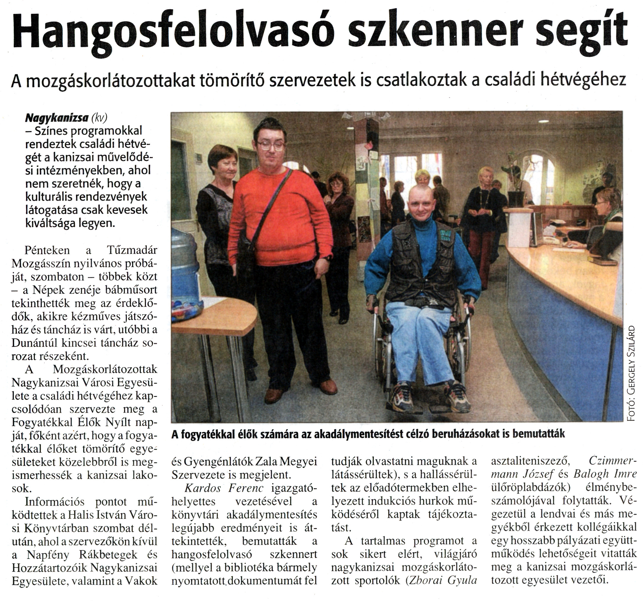 Nyilvános 1848 | 4966 | Zalai Hírlap 2010. november 23. 272. szám 11. oldal - Hangosfelolvasó szkenner segít | A cikk szövege: Hangosfelolvasó szkenner segít A mozgáskorlátozottakat tömörítő szervezetek is csatlakoztak a családi hétvégéhez A fogyatékkal élők számára az akadálymentesítést célzó beruházásokat is bemutatták Nagykanizsa (kv) - Színes programokkal rendeztek családi hétvégét a kanizsai művelődési intézményekben, ahol nem szeretnék, hogy a kulturális rendezvények látogatása csak kevesek kiváltsága legyen. Pénteken a Tűzmadár Mozgásszín nyilvános próbáját, szombaton - többek közt - a Népek zenéje bábműsort tekinthették meg az érdeklődők, akikre kézműves játszóház és táncház is várt, utóbbi a Dunántúl kincsei táncház sorozat részeként. A Mozgáskorlátozottak Nagykanizsai Városi Egyesülete a családi hétvégéhez kapcsolódóan szervezte meg a Fogyatékkal Élők Nyílt napját, főként azért, hogy a fogyatékkal élőket tömörítő egyesületeket közelebbről is megismerhessék a kanizsai lakosok. Információs pontot működtettek a Halis István Városi Könyvtárban szombat délután, ahol a szervezőkön kívül a Napfény Rákbetegek és Hozzátartozóik Nagykanizsai Egyesülete, valamint a Vakok és Gyengénlátók Zala Megyei Szervezete is megjelent. Kardos Ferenc igazgatóhelyettes vezetésével a könyvtári akadálymentesítés legújabb eredményeit is áttekintették, bemutatták a hangosfelolvasó szkennert (mellyel a bibliotéka bármely nyomtatott, dokumentumát fel tudják olvastatni maguknak a látássérültek), s a hallássérültek az előadótermekben elhelyezett indukciós hurkok működéséről kaptak tájékoztatást. A tartalmas programot a sok sikert elért, világjáró nagykanizsai mozgáskorlátozott sportolók (Zborai Gyula asztaliteniszező, Czimmer-mann József és Balogh Imre ülőröplabdázók) élménybeszámolójával folytatták. Végezetül a lendvai és más megyékből érkezett kollégáikkal egy hosszabb pályázati együttműködés lehetőségeit vitatták meg a kanizsai mozgáskorlátozott egyesület vezetői. |