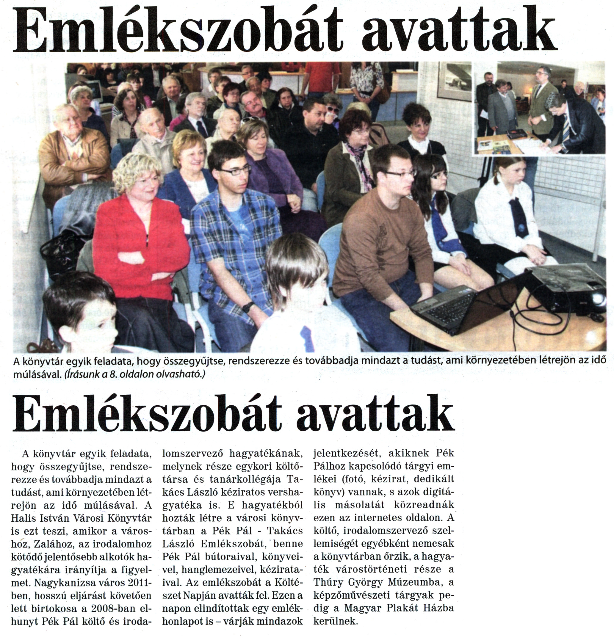 Nyilvános 1804 | 5289 | Nagykanizsai Maraton 2012. április 13. 14. szám 1. és 8. oldal - Emlékszobát avattak | Emlékszobát avattak A könyvtár egyik feladata, hogy összegyűjtse, rendszerezze és továbbadja mindazt a tudást, ami környezetében létrejön az idő múlásával. (Írásunk a 8. oldalon olvasható.) Emlékszobát avattak A könyvtár egyik feladata, hogy összegyűjtse, rendszerezze és továbbadja mindazt a tudást, ami környezetében létrejön az idő múlásával. A Halis István Városi Könyvtár is ezt teszi, amikor a városhoz, Zalához, az irodalomhoz kötődő jelentősebb alkotók hagyatékára irányítja a figyelmet. Nagykanizsa város 2011-ben, hosszú eljárást követően lett birtokosa a 2008-ban elhunyt Pék Pál költő és irodalomszervező hagyatékának, melynek része egykori költőtársa és tanárkollégája Takács László kéziratos vershagyatéka is. E hagyatékból hozták létre a városi könyvtárban a Pék Pál - Takács László Emlékszobát, benne Pék Pál bútoraival, könyveivel, hanglemezeivel, kézirataival. Az emlékszobát a Költészet Napján avatták fel. Ezen a napon elindítottak egy emlékhonlapot is - várják mindazok jelentkezését, akiknek Pék Pálhoz kapcsolódó tárgyi emlékei (fotó, kézirat, dedikált könyv) vannak, s azok digitális másolatát közreadnák ezen az internetes oldalon. A költő, irodalomszervező szellemiségét egyébként nemcsak a könyvtárban őrzik, a hagyaték várostörténeti része a Thúry György Múzeumba, a képzőművészeti tárgyak pedig a Magyar Plakát Házba kerülnek. |