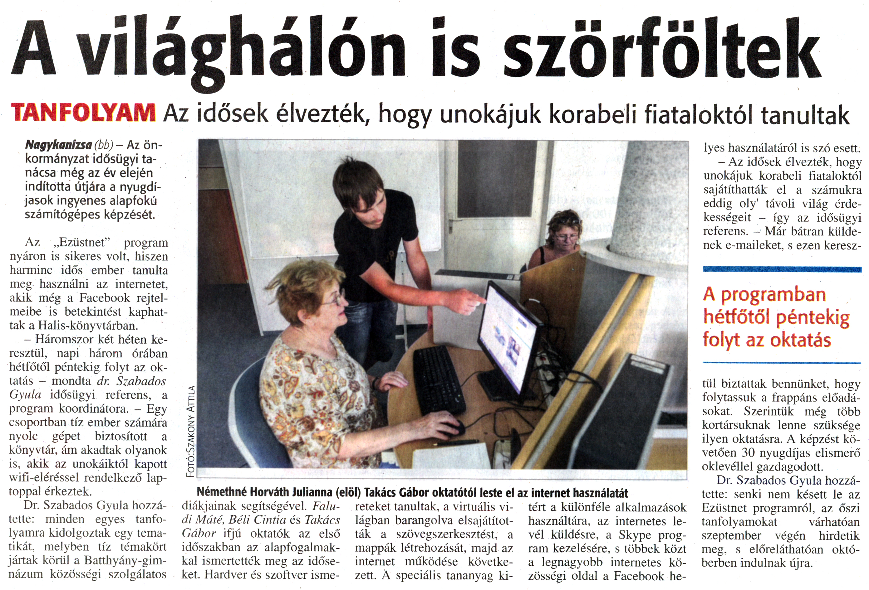 Nyilvános 1852 | 3537 | Zalai Hírlap 2014. szeptember 4. 206. szám 4. oldal | A világhálón is szörföltek TANFOLYAM Az idősek élvezték, hogy unokájuk korabeli fiataloktól tanultak Nagykanizsa (bb) - Az önkormányzat idősügyi tanácsa még az év elején indította útjára a nyugdíjasok ingyenes alapfokú számítógépes képzését. Az „Ezüstnet" program nyáron is sikeres volt, hiszen harminc idős ember tanulta meg használni az internetet, akik még a Facebook rejtelmeibe is betekintést kaphattak a Halis-könyvtárban. - Háromszor két héten keresztül, napi három órában hétfőtől péntekig folyt az oktatás - mondta dr. Szabados Gyula idősügyi referens, a program koordinátora. - Egy csoportban tíz ember számára nyolc gépet biztosított a könyvtár, ám akadtak olyanok is, akik az unokáiktól kapott wifi-eléréssel rendelkező laptoppal érkeztek. Dr. Szabados Gyula hozzátette: minden egyes tanfolyamra kidolgoztak egy tematikát, melyben tíz témakört jártak körül a Batthyány-gimnázum közösségi szolgálatos diákjainak segítségével. Faludi Máté, Béli Cintia és Takács Gábor ifjú oktatók az első időszakban az alapfogalmakkal ismertették meg az időseket. Hardver és szoftver ismereteket tanultak, a virtuális világban barangolva elsajátították a szövegszerkesztést, a mappák létrehozását, majd az internet működése következett. A speciális tananyag kitért a különféle alkalmazások használatára, az internetes levél küldésre, a Skype program kezelésére, s többek közt a legnagyobb internetes közösségi oldal a Facebook helyes használatáról is szó esett. - Az idősek élvezték, hogy unokájuk korabeli fiataloktól sajátíthatták el a számukra eddig oly\' távoli világ érdekességeit - így az idősügyi referens. - Már bátran küldenek e-maileket, s ezen keresztül biztattak bennünket, hogy folytassuk a frappáns előadásokat. Szerintük még több kortársuknak lenne szüksége ilyen oktatásra. A képzést követően 30 nyugdíjas elismerő oklevéllel gazdagodott. Dr. Szabados Gyula hozzátette: senki nem késett le az Ezüstnet programról, az őszi tanfolyamokat várhatóan szeptember végén hirdetik meg, s előreláthatóan októberben indulnak újra. Némethné Horváth Julianna (elöl) Takács Gábor oktatótól leste el az internet használatát A programban hétfőtől péntekig folyt az oktatás |