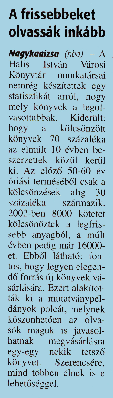 Nyilvános 1749 | 3338 | Zalai Hírlap 2016. február 15. 38. szám 4. oldal | A frissebbeket olvassák inkább Nagykanizsa (hba) - A Halis István Városi Könyvtár munkatársai nemrég készítettek egy statisztikát arról, hogy mely könyvek a legolvasottabbak. Kiderült: hogy a kölcsönzött könyvek 70 százaléka az elmúlt 10 évben beszerzettek közül kerül ki. Az előző 50-60 év óriási terméséből csak a kölcsönzések alig 30 százaléka származik. 2002-ben 8000 kötetet kölcsönöztek a legfrissebb anyagból, a múlt évben pedig már 16000-et. Ebből látható: fontos, hogy legyen elegendő forrás új könyvek vásárlására. Ezért alakították ki a mutatványpéldányok polcát, melynek köszönhetően az olvasók maguk is javasolhatnak megvásárlásra egy-egy nekik tetsző könyvet. Szerencsére, mind többen élnek is e lehetőséggel. |