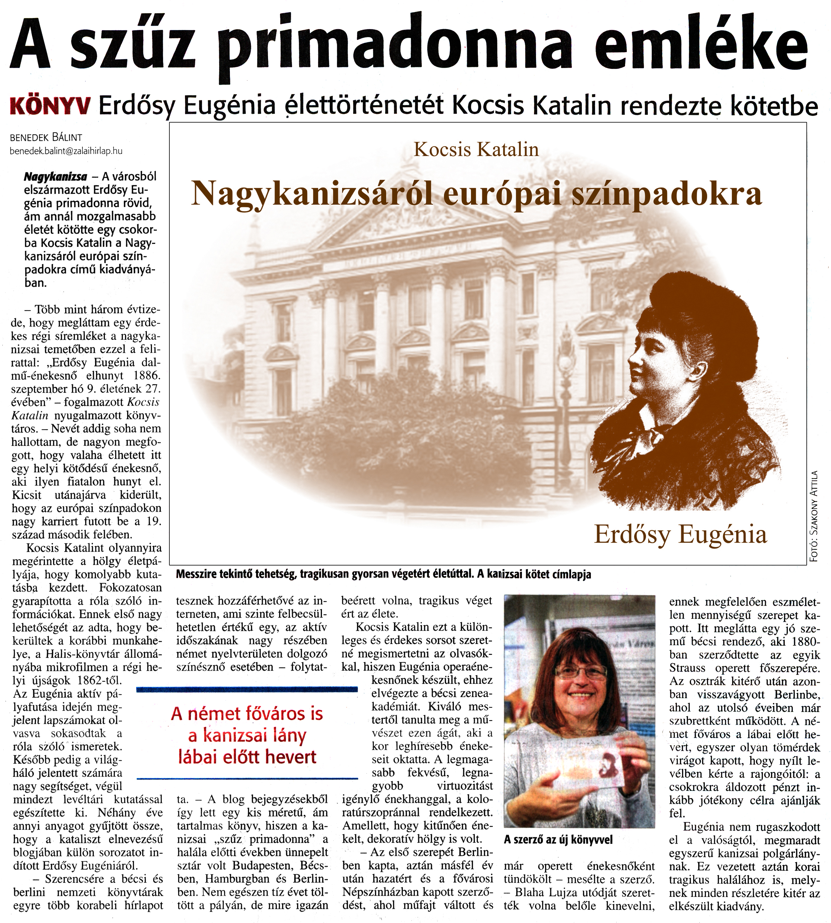 Nyilvános 1642 | 3213 | Zalai Hírlap 2016. december 28. 304. szám 7. oldal | A szűz primadonna emléke KÖNYV Erdősy Eugénia élettörténetét Kocsis Katalin rendezte kötetbe BENEDEK BÁLINT Nagykanizsa - A városból elszármazott Erdősy Eugénia primadonna rövid, ám annál mozgalmasabb életét kötötte egy csokorba Kocsis Katalin a Nagykanizsáról európai színpadokra című kiadványában. - Több mint három évtizede, hogy megláttam egy érdekes régi síremléket a nagykanizsai temetőben ezzel a felirattal: „Erdősy Eugénia dalmű-énekesnő elhunyt 1886. szeptember hó 9. életének 27. évében" - fogalmazott Kocsis Katalin nyugalmazott könyvtáros. - Nevét addig soha nem hallottam, de nagyon megfogott, hogy valaha élhetett itt egy helyi kötődésű énekesnő, aki ilyen fiatalon hunyt el. Kicsit utánajárva kiderült, hogy az európai színpadokon nagy karriert futott be a 19. század második felében. Kocsis Katalint olyannyira megérintette a hölgy életpályája, hogy komolyabb kutatásba kezdett. Fokozatosan gyarapította a róla szóló információkat. Ennek első nagy lehetőségét az adta, hogy bekerültek a korábbi munkahelye, a Halis-könyvtár állományába mikrofilmen a régi helyi újságok 1862-től. Az Eugénia aktív pályafutása idején megjelent lapszámokat olvasva sokasodtak a róla szóló ismeretek. Később pedig a világháló jelentett számára nagy segítséget, végül mindezt levéltári kutatással egészítette ki. Néhány éve annyi anyagot gyűjtött össze, hogy a kataliszt elnevezésű blogjában külön sorozatot indított Erdősy Eugéniáról. - Szerencsére a bécsi és berlini nemzeti könyvtárak egyre több korabeli hírlapot Fotó: Szakony Attila Messzire tekintő tehetség, tragikusan gyorsan végetért életúttal. A kaiizsai kötet címlapja tesznek hozzáférhetővé az interneten, ami szinte felbecsülhetetlen értékű egy, az aktív időszakának nagy részében német nyelvterületen dolgozó színésznő esetében - folytatta. - A blog bejegyzésekből így lett egy kis méretű, ám tartalmas könyv, hiszen a kanizsai „szűz primadonna" a halála előtti években ünnepelt sztár volt Budapesten, Bécsben, Hamburgban és Berlinben. Nem egészen tíz évet töltött a pályán, de mire igazán beérett volna, tragikus véget ért az élete. Kocsis Katalin ezt a különleges és érdekes sorsot szeretné megismertetni az olvasókkal, hiszen Eugénia operaénekesnőnek készült, ehhez elvégezte a bécsi zeneakadémiát. Kiváló mestertől tanulta meg a művészet ezen ágát, aki a kor leghíresebb énekeseit oktatta. A legmagasabb fekvésű, legnagyobb virtuozitást igénylő énekhanggal, a koloratúrszopránnal rendelkezett. Amellett, hogy kitűnően énekelt, dekoratív hölgy is volt. - Az első szerepét Berlinben kapta, aztán másfél év után hazatért és a fővárosi Népszínházban kapott szerződést, ahol műfajt váltott és A szerző az új könyvvel már operett énekesnőként tündökölt - mesélte a szerző. - Blaha Lujza utódját szerették volna belőle kinevelni, ennek megfelelően eszméletlen mennyiségű szerepet kapott. Itt meglátta egy jó szemű bécsi rendező, aki 1880-ban szerződtette az egyik Strauss operett főszerepére. Az osztrák kitérő után azonban visszavágyott Berlinbe, ahol az utolsó éveiben már szubrettként működött. A német főváros a lábai előtt hevert, egyszer olyan tömérdek virágot kapott, hogy nyílt levélben kérte a rajongóitól: a csokrokra áldozott pénzt inkább jótékony célra ajánlják fel. Eugénia nem rugaszkodott el a valóságtól, megmaradt egyszerű kanizsai polgárlánynak. Ez vezetett aztán korai tragikus halálához is, melynek minden részletére kitér az elkészült kiadvány. |