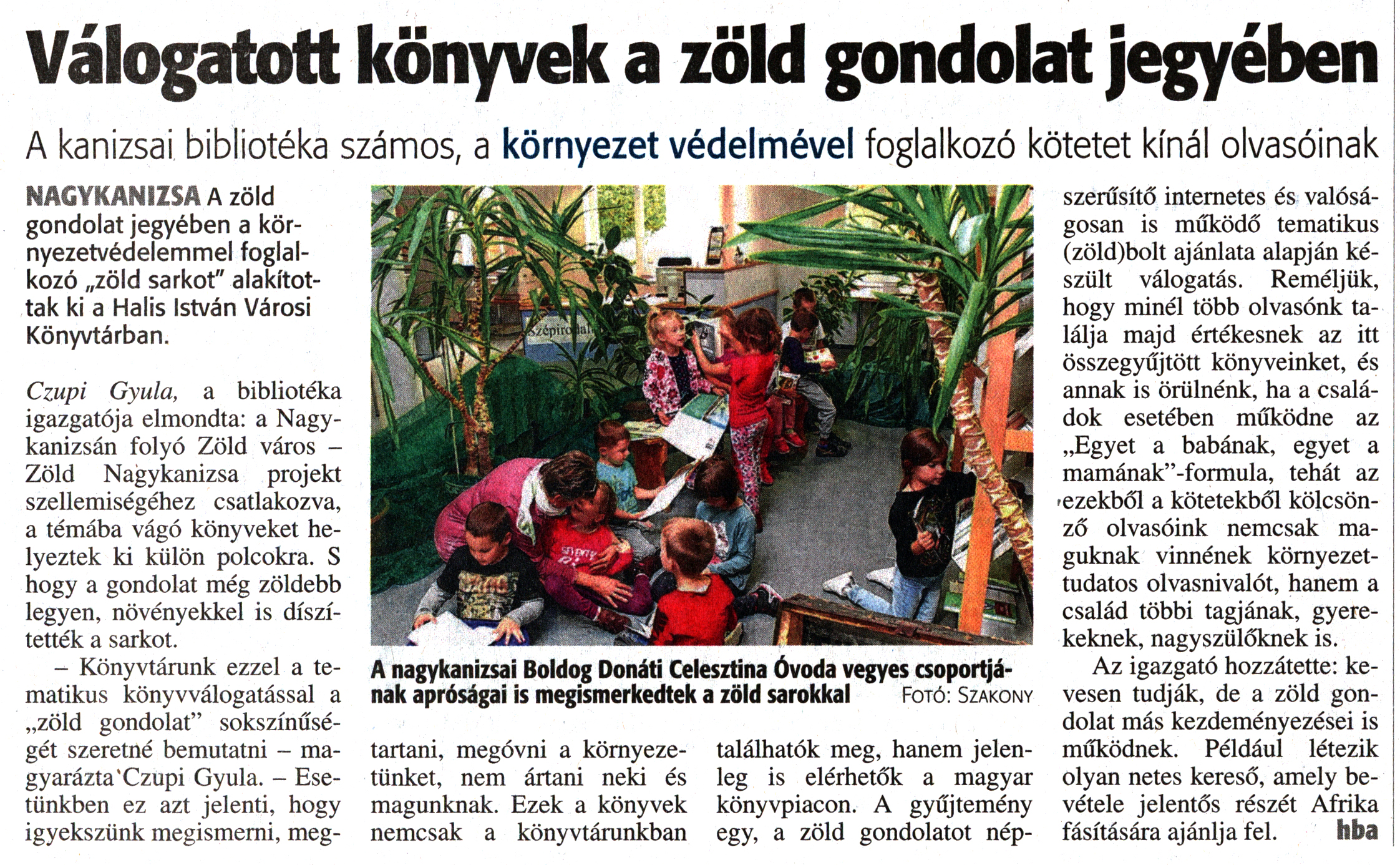 Nyilvános 1671 | 3124 | Zalai Hírlap 2017. szeptember 30. 229. szám 4. oldal | Válogatott könyvek a zöld gondolat jegyében A kanizsai bibliotéka számos, a környezet védelmével foglalkozó kötetet kínál olvasóinak NAGYKANIZSA A zöld gondolat jegyében a környezetvédelemmel foglalkozó „zöld sarkot" alakítottak ki a Halis István Városi Könyvtárban. Czupi Gyula, a bibliotéka igazgatója elmondta: a Nagykanizsán folyó Zöld város -Zöld Nagykanizsa projekt szellemiségéhez csatlakozva, a témába vágó könyveket helyeztek ki külön polcokra. S hogy a gondolat még zöldebb legyen, növényekkel is díszítették a sarkot. - Könyvtárunk ezzel a tematikus könyvválogatással a „zöld gondolat" sokszínűségét szeretné bemutatni - magyarázta Czupi Gyula. - Esetünkben ez azt jelenti, hogy igyekszünk megismerni, megtartani, megóvni a környezetünket, nem ártani neki és magunknak. Ezek a könyvek nemcsak a könyvtárunkban találhatók meg, hanem jelenleg is elérhetők a magyar könyvpiacon. A gyűjtemény egy, a zöld gondolatot népszerűsítő internetes és valóságosan is működő tematikus (zöld)bolt ajánlata alapján készült válogatás. Reméljük, hogy minél több olvasónk találja majd értékesnek az itt összegyűjtött könyveinket, és annak is örülnénk, ha a családok esetében működne az „Egyet a babának, egyet a mamának”-formula, tehát az ezekből a kötetekből kölcsönző olvasóink nemcsak maguknak vinnének környezettudatos olvasnivalót, hanem a család többi tagjának, gyerekeknek, nagyszülőknek is. Az igazgató hozzátette: kevesen tudják, de a zöld gondolat más kezdeményezései is működnek. Például létezik olyan netes kereső, amely bevétele jelentős részét Afrika fásítására ajánlja fel. hba A nagykanizsai Boldog Donáti Celesztina Óvoda vegyes csoportjának apróságai is megismerkedtek a zöld sarokkal Fotó: Szakony |