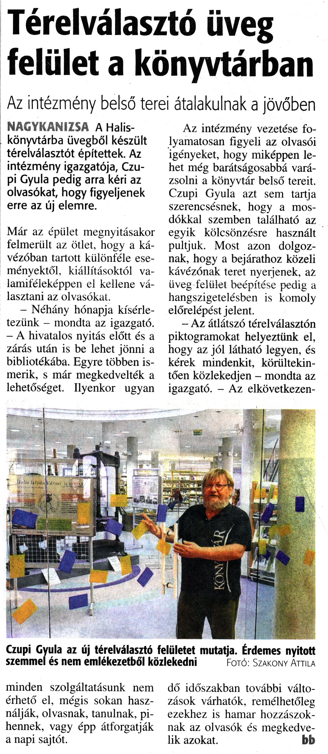 Nyilvános 4264 | 2935 | Zalai Hírlap 2018. február 13. 37. szám 3. oldal | Térelválasztó üveg felület a könyvtárban Az intézmény belső terei átalakulnak a jövőben Czupi Gyula az új térelválasztó felületet mutatja. Érdemes nyitott szemmel és nem emlékezetből közlekedni Fotó: Szakony Attila NAGYKANIZSA A Halis-könyvtárba üvegből készült térelválasztót építettek. Az intézmény igazgatója, Czupi Gyula pedig arra kéri az olvasókat, hogy figyeljenek erre az új elemre. Már az épület megnyitásakor felmerült az ötlet, hogy a kávézóban tartott különféle eseményektől, kiállításoktól valamiféleképpen el kellene választani az olvasókat. - Néhány hónapja kísérletezünk - mondta az igazgató. - A hivatalos nyitás előtt és a zárás után is be lehet jönni a bibliotékába. Egyre többen ismerik, s már megkedvelték a lehetőséget. Ilyenkor ugyan minden szolgáltatásunk nem érhető el, mégis sokan használják, olvasnak, tanulnak, pihennek, vagy épp átforgatják a napi sajtót. Az intézmény vezetése folyamatosan figyeli az olvasói igényeket, hogy miképpen lehet még barátságosabbá varázsolni a könyvtár belső tereit. Czupi Gyula azt sem tartja szerencsésnek, hogy a mosdókkal szemben található az egyik kölcsönzésre használt pultjuk. Most azon dolgoznak, hogy a bejárathoz közeli kávézónak teret nyerjenek, az üveg felület beépítése pedig a hangszigetelésben is komoly előrelépést jelent. - Az átlátszó térelválasztón piktogramokat helyeztünk el, hogy az jól látható legyen, és kérek mindenkit, körültekintően közlekedjen - mondta az igazgató. - Az elkövetkezendő időszakban további változások várhatók, remélhetőleg ezekhez is hamar hozzászoknak az olvasók és megkedvelik azokat. bb |
