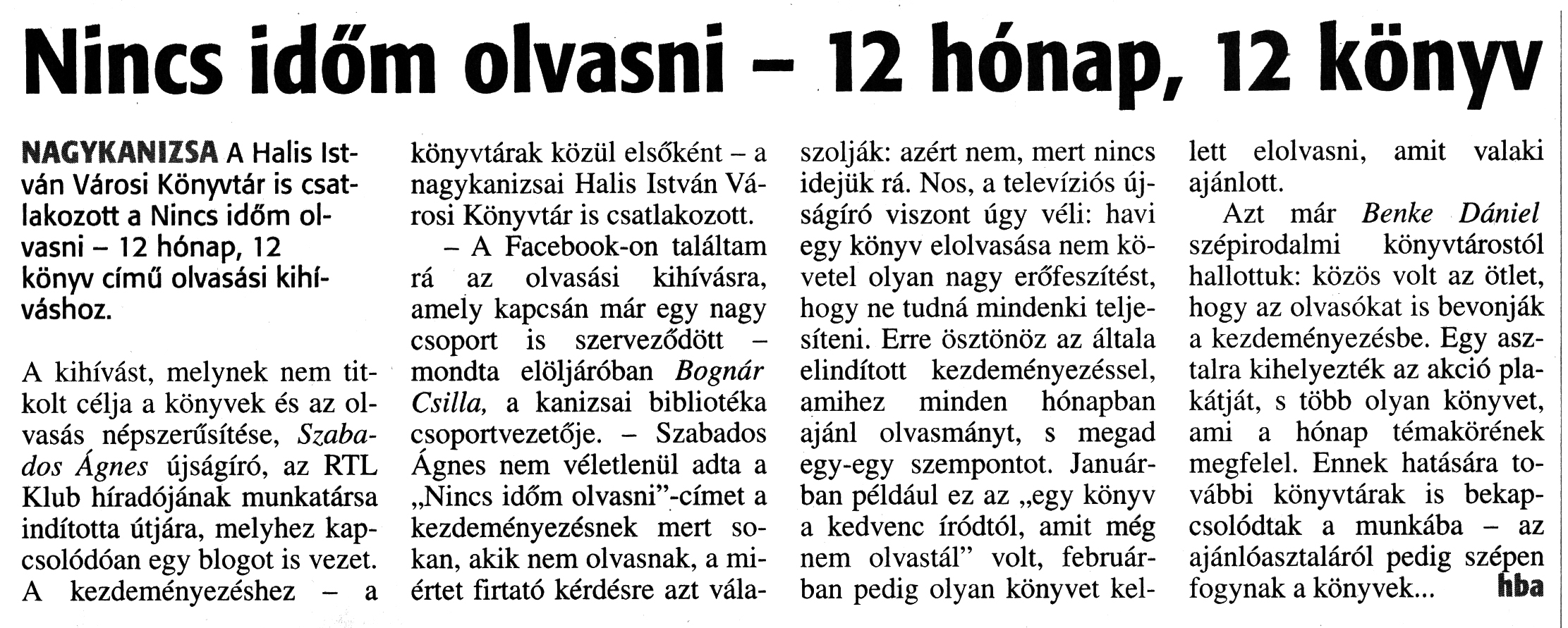 Nyilvános 1673 | 3031 | Zalai Hírlap 2018. március 6. 55. szám 13. oldal | Nincs időm olvasni - 12 hónap, 12 könyv NAGYKANIZSA A Halis István Városi Könyvtár is csatlakozott a Nincs időm olvasni - 12 hónap, 12 könyv című olvasási kihíváshoz. A kihívást, melynek nem titkolt célja a könyvek és az olvasás népszerűsítése, Szabados Ágnes újságíró, az RTL Klub híradójának munkatársa indította útjára, melyhez kapcsolódóan egy blogot is vezet. A kezdeményezéshez - a könyvtárak közül elsőként - a nagykanizsai Halis István Városi Könyvtár is csatlakozott. - A Facebook-on találtam rá az olvasási kihívásra, amely kapcsán már egy nagy csoport is szerveződött -mondta elöljáróban Bognár Csilla, a kanizsai bibliotéka csoportvezetője. - Szabados Ágnes nem véletlenül adta a „Nincs időm olvasni"-címet a kezdeményezésnek mert sokan, akik nem olvasnak, a miértet firtató kérdésre azt válaszolják: azért nem, mert nincs idejük rá. Nos, a televíziós újságíró viszont úgy véli: havi egy könyv elolvasása nem követel olyan nagy erőfeszítést, hogy ne tudná mindenki teljesíteni. Erre ösztönöz az általa elindított kezdeményezéssel, amihez minden hónapban ajánl olvasmányt, s megad egy-egy szempontot. Januárban például ez az „egy könyv a kedvenc íródtól, amit még nem olvastál" volt, februárban pedig olyan könyvet kellett elolvasni, amit valaki ajánlott. Azt már Benke Dániel szépirodalmi könyvtárostól hallottuk: közös volt az ötlet, hogy az olvasókat is bevonják a kezdeményezésbe. Egy asztalra kihelyezték az akció plakátját, s több olyan könyvet, ami a hónap témakörének megfelel. Ennek hatására további könyvtárak is bekapcsolódtak a munkába - az ajánlóasztaláról pedig szépen fogynak a könyvek... hba |