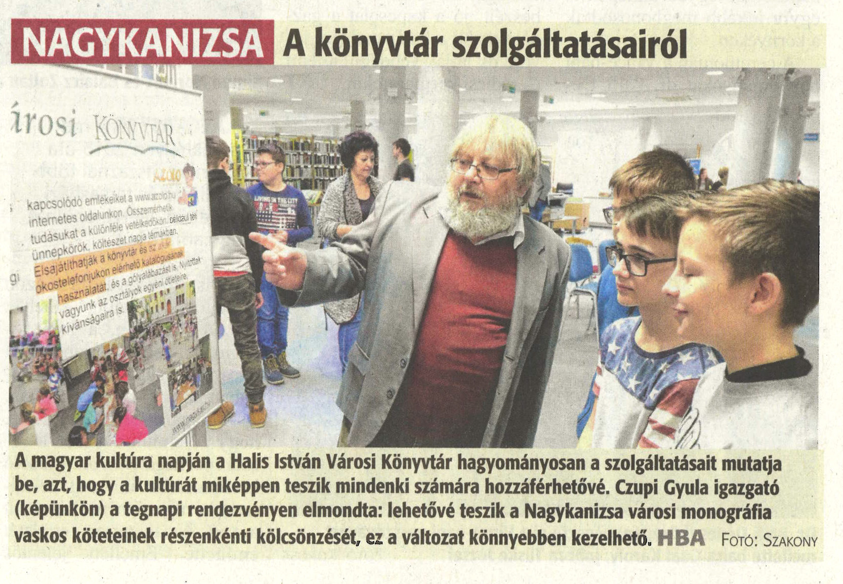 Nyilvános 1530 | 2867 | Zalai Hírlap 2019. január 23. 19. szám 4. oldal - A könyvtár szolgáltatásairól | A magyar kultúra napján a Halis István Városi Könyvtár hagyományosan a szolgáltatásait mutatja be, azt, hogy a kultúrát miképpen teszik mindenki számára hozzáférhetővé. Czupi Gyula igazgató (képünkön) a tegnapi rendezvényen elmondta: lehetővé teszik a Nagykanizsa városi monográfia köteteinek részenkénti kölcsönzését, ez a változat könnyebben kezelhető. |