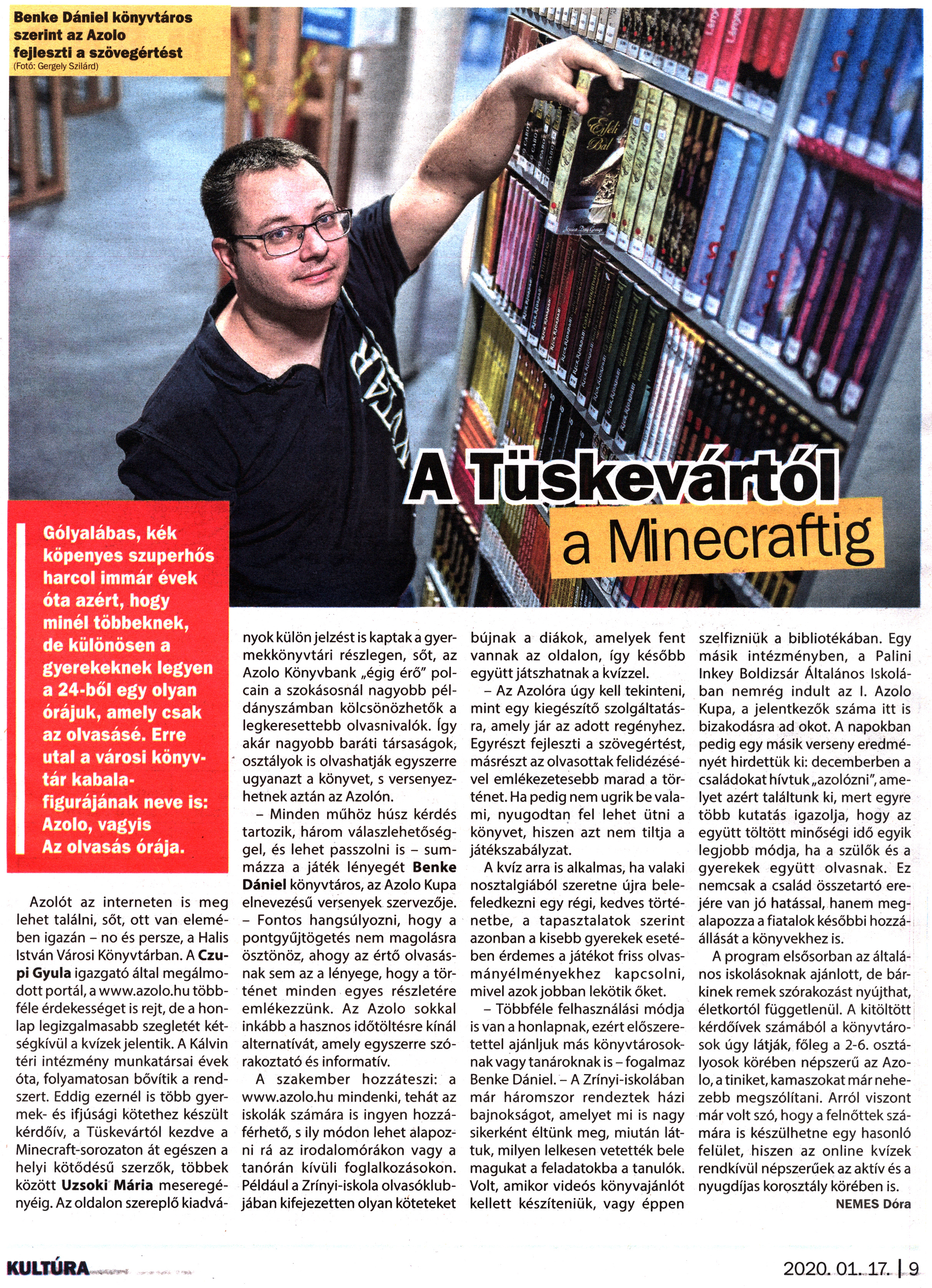 Nyilvános 1579 | 3017 | Kanizsa 2020. január 17. 2. szám 9. oldal - A Tüskevártól a Minecraftig | Gólyalábas, kék köpenyes szuperhős harcol immár évek óta azért, hogy minél többeknek, de különösen a gyerekeknek legyen a 24-ből egy olyan órájuk, amely csak az olvasásé. Erre utal a városi könyvtár kabalafigurájának neve is: Azolo, vagyis Az olvasás órája. Benke Dániel könyvtáros szerint az Azolo fejleszti a szövegértést (Fotó: Gergely Szilárd) Azolót az interneten is meg lehet találni, sőt, ott van elemében igazán - no és persze, a Halis István Városi Könyvtárban. A Czupi Gyula igazgató által megálmodott portál, a www.azolo.hu többféle érdekességet is rejt, de a honlap legizgalmasabb szegletét kétségkívül a kvízek jelentik. A Kálvin téri intézmény munkatársai évek óta, folyamatosan bővítik a rendszert. Eddig ezernél is több gyermek- és ifjúsági kötethez készült kérdőív, a Tüskevártól kezdve a Minecraft-sorozaton át egészen a helyi kötődésű szerzők, többek között Uzsoki Mária meseregényéig. Az oldalon szereplő kiadványok külön jelzést is kaptak a gyermekkönyvtári részlegen, sőt, az Azolo Könyvbank „égig érő" polcain a szokásosnál nagyobb példányszámban kölcsönözhetők a legkeresettebb olvasnivalók. így akár nagyobb baráti társaságok, osztályok is olvashatják egyszerre ugyanazt a könyvet, s versenyezhetnek aztán az Azolón. - Minden műhöz húsz kérdés tartozik, három válaszlehetőséggel, és lehet passzolni is - summázza a játék lényegét Benke Dániel könyvtáros, az Azolo Kupa elnevezésű versenyek szervezője. - Fontos hangsúlyozni, hogy a pontgyűjtögetés nem magolásra ösztönöz, ahogy az értő olvasásnak sem az a lényege, hogy a történet minden egyes részletére emlékezzünk. Az Azolo sokkal inkább a hasznos időtöltésre kínál alternatívát, amely egyszerre szórakoztató és informatív. A szakember hozzáteszi: a www.azolo.hu mindenki, tehát az iskolák számára is ingyen hozzáférhető, s ily módon lehet alapozni rá az irodalomórákon vagy a tanórán kívüli foglalkozásokon. Például a Zrínyi-iskola olvasóklubjában kifejezetten olyan köteteket bújnak a diákok, amelyek fent vannak az oldalon, így később együtt játszhatnak a kvízzel. - Az Azolóra úgy kell tekinteni, mint egy kiegészítő szolgáltatásra, amely jár az adott regényhez. Egyrészt fejleszti a szövegértést, másrészt az olvasottak felidézésével emlékezetesebb marad a történet. Ha pedig nem ugrik be valami, nyugodtan fel lehet ütni a könyvet, hiszen azt nem tiltja a játékszabályzat. A kvíz arra is alkalmas, ha valaki nosztalgiából szeretne újra belefeledkezni egy régi, kedves történetbe, a tapasztalatok szerint azonban a kisebb gyerekek esetében érdemes a játékot friss olvasmányélményekhez kapcsolni, mivel azok jobban lekötik őket. - Többféle felhasználási módja is van a honlapnak, ezért előszeretettel ajánljuk más könyvtárosoknak vagy tanároknak is-fogalmaz Benke Dániel. - A Zrínyi-iskolában már háromszor rendeztek házi bajnokságot, amelyet mi is nagy sikerként éltünk meg, miután láttuk, milyen lelkesen vetették bele magukat a feladatokba a tanulók. Volt, amikor videós könyvajánlót kellett készíteniük, vagy éppen szelfizniük a bibliotékában. Egy másik intézményben, a Palini Inkey Boldizsár Általános Iskolában nemrég indult az I. Azolo Kupa, a jelentkezők száma itt is bizakodásra ad okot. A napokban pedig egy másik verseny eredményét hirdettük ki: decemberben a családokat hívtuk „azolózni", amelyet azért találtunk ki, mert egyre több kutatás igazolja, hogy az együtt töltött minőségi idő egyik legjobb módja, ha a szülők és a gyerekek együtt olvasnak. Ez nemcsak a család összetartó erejére van jó hatással, hanem megalapozza a fiatalok későbbi hozzáállását a könyvekhez is. A program elsősorban az általános iskolásoknak ajánlott, de bárkinek remek szórakozást nyújthat, életkortól függetlenül. A kitöltött kérdőívek számából a könyvtárosok úgy látják, főleg a 2-6. osztályosok körében népszerű az Azolo, a tiniket, kamaszokat már nehezebb megszólítani. Arról viszont már volt szó, hogy a felnőttek számára is készülhetne egy hasonló felület, hiszen az online kvízek rendkívül népszerűek az aktív és a nyugdíjas korosztály körében is. NEMES Dóra |