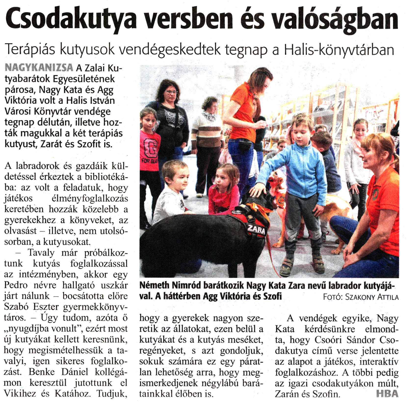 Nyilvános 1323 | 2004 | Zalai Hírlap 2020. február 29. 51. szám 3. oldal | Csodakutya versben és valóságban Terápiás kutyusok vendégeskedtek tegnap a Halis-könyvtárban Németh Nimród barátkozik Nagy Kata Zara nevű labrador kutyájával. A háttérben Agg Viktória és Szofi Fotó: Szakony Attila NAGYKANIZSA A Zalai Kutyabarátok Egyesületének párosa, Nagy Kata és Agg Viktória volt a Halis István Városi Könyvtár vendége tegnap délután, illetve hozták magukkal a két terápiás kutyust, Zarát és Szofit is. A labradorok és gazdáik küldetéssel érkeztek a bibliotékába: az volt a feladatuk, hogy játékos élményfoglalkozás keretében hozzák közelebb a gyerekekhez a könyveket, az olvasást - illetve, nem utolsósorban, a kutyusokat. - Tavaly már próbálkoztunk kutyás foglalkozással az intézményben, akkor egy Pedro névre hallgató uszkár járt nálunk - bocsátotta előre Szabó Eszter gyermekkönyvtáros. - Úgy tudom, azóta ő „nyugdíjba vonult", ezért most új kutyákat kellett keresnünk, hogy megismételhessük a tavalyi, igen sikeres foglalkozást. Benke Dániel kollégámon keresztül jutottunk el Vikihez és Katához. Tudjuk, hogy a gyerekek nagyon szeretik az állatokat, ezen belül a kutyákat és a kutyás meséket, regényeket, s azt gondoljuk, sokuk számára ez egy páratlan lehetőség arra, hogy megismerkedjenek négylábú barátainkkal élőben is. A vendégek egyike, Nagy Kata kérdésünkre elmondta, hogy Csoóri Sándor Csodakutya című verse jelentette az alapot a játékos, interaktív foglalkozáshoz. A többi pedig az igazi csodakutyákon múlt, Zarán és Szofin. HBA |