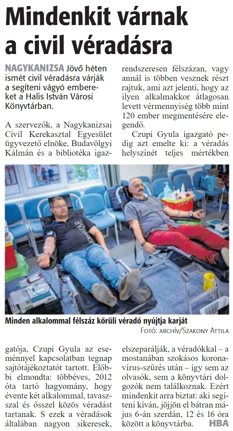 Nyilvános 1406 | 2235 | Zalai Hírlap 2020. április 29. 100. szám 3. oldal | Mindenkit várnak a civil véradásra NAGYKANIZSA Jövő héten ismét civil véradásra várják a segíteni vágyó embereket a Halis István Városi Könyvtárban. A szervezők, a Nagykanizsai Civil Kerekasztal Egyesület ügyvezető elnöke, Budavölgyi Kálmán és a bibliotéka igazgatója, Czupi Gyula az eseménnyel kapcsolatban tegnap sajtótájékoztatót tartott. Előbbi elmondta: többéves, 2012 óta tartó hagyomány, hogy évente két alkalommal, tavasszal és ősszel közös véradást tartanak. S ezek a véradások általában nagyon sikeresek, rendszeresen félszázán, vagy annál is többen vesznek részt rajtuk, ami azt jelenti, hogy az ilyen alkalmakkor átlagosan levett vérmennyiség több mint 120 ember megmentésére elegendő. Czupi Gyula igazgató pedig azt emelte ki: a véradás helyszínét teljes mértékben elszeparálják, a véradókkal - a mostanában szokásos koronavírus-szűrés után - így sem az olvasók, sem a könyvtári dolgozók nem találkoznak. Ezért mindenkit arra biztat: aki segíteni kíván, jöjjön el bátran május 6-án szerdán, 12 és 16 óra között a könyvtárba. HBA Minden alkalommal félszáz körüli véradó nyújtja karját Fotó: archív/Szakony Attila |
