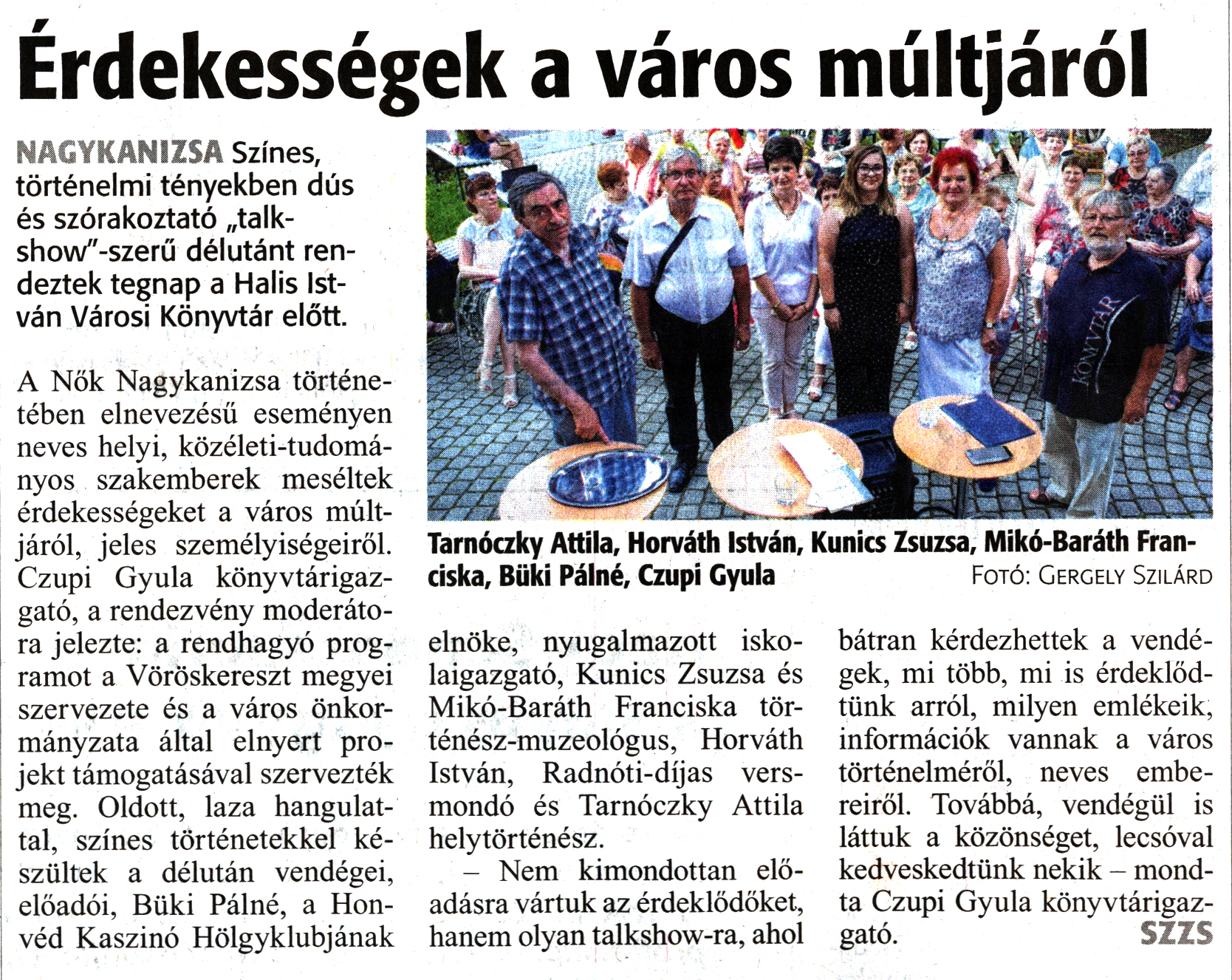 Nyilvános 1333 | 2088 | Zalai Hírlap 2020. július 30. 177. szám 16. oldal | Érdekességek a város múltjáról Tarnóczky Attila, Horváth István, Kunics Zsuzsa, Mikó-Baráth Franciska, Büki Pálné, Czupi Gyula Fotó: Gergely Szilárd NAGYKANIZSA Színes, történelmi tényekben dús és szórakoztató „talk-show"-szerű délutánt rendeztek tegnap a Halis István Városi Könyvtár előtt. A Nők Nagykanizsa történetében elnevezésű eseményen neves helyi, közéleti-tudományos szakemberek meséltek érdekességeket a város múltjáról, jeles személyiségeiről. Czupi Gyula könyvtárigazgató, a rendezvény moderátora jelezte: a rendhagyó programot a Vöröskereszt megyei szervezete és a város önkormányzata által elnyert projekt támogatásával szervezték meg. Oldott, laza hangulattal, színes történetekkel készültek a délután vendégei, előadói, Büki Pálné, a Honvéd Kaszinó Hölgyklubjának elnöke, nyugalmazott iskolaigazgató, Kunics Zsuzsa és Mikó-Baráth Franciska történész-muzeológus, Horváth István, Radnóti-díjas versmondó és Tarnóczky Attila helytörténész. - Nem kimondottan előadásra vártuk az érdeklődőket, hanem olyan talkshow-ra, ahol bátran kérdezhettek a vendégek, mi több, mi is érdeklődtünk arról, milyen emlékeik, információk vannak a város történelméről, neves embereiről. Továbbá, vendégül is láttuk a közönséget, lecsóval kedveskedtünk nekik - mondta Czupi Gyula könyvtárigazgató. szzs |