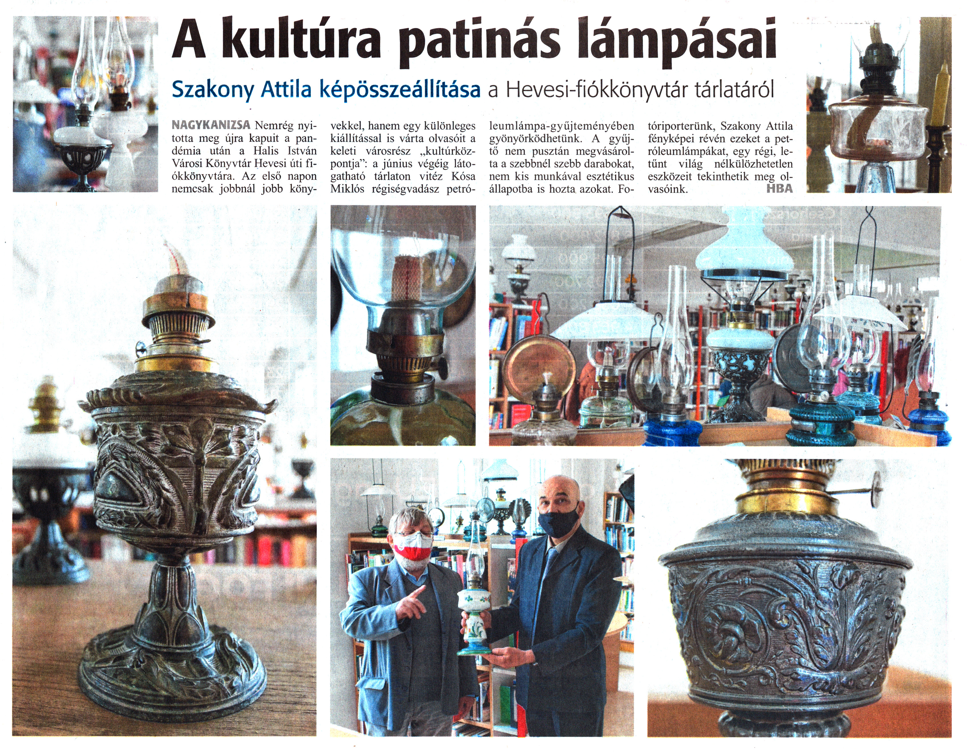 Nyilvános 1236 | 1971 | Zalai Hírlap 2021. május 26. 119. szám 5. oldal | A kultúra patinás lámpásai Szakony Attila képösszeállítása a Hevesi-fiókkönyvtár tárlatáról NAGYKANIZSA Nemrég nyitotta meg újra kapuit a pandémia után a Halis István Városi Könyvtár Hevesi úti fiókkönyvtára. Az első napon nemcsak jobbnál jobb könyvekkel, hanem egy különleges kiállítással is várta olvasóit a keleti városrész „kultúrközpontja": a június végéig látogatható tárlaton vitéz Kósa Miklós régiségvadász petróleumlámpa-gyűjteményében gyönyörködhetünk. A gyűjtő nem pusztán megvásárolta a szebbnél szebb darabokat, nem kis munkával esztétikus állapotba is hozta azokat. Fotóriporterünk, Szakony Attila fényképei révén ezeket a petróleumlámpákat, egy régi, letűnt világ nélkülözhetetlen eszközeit tekinthetik meg olvasóink. HBA |