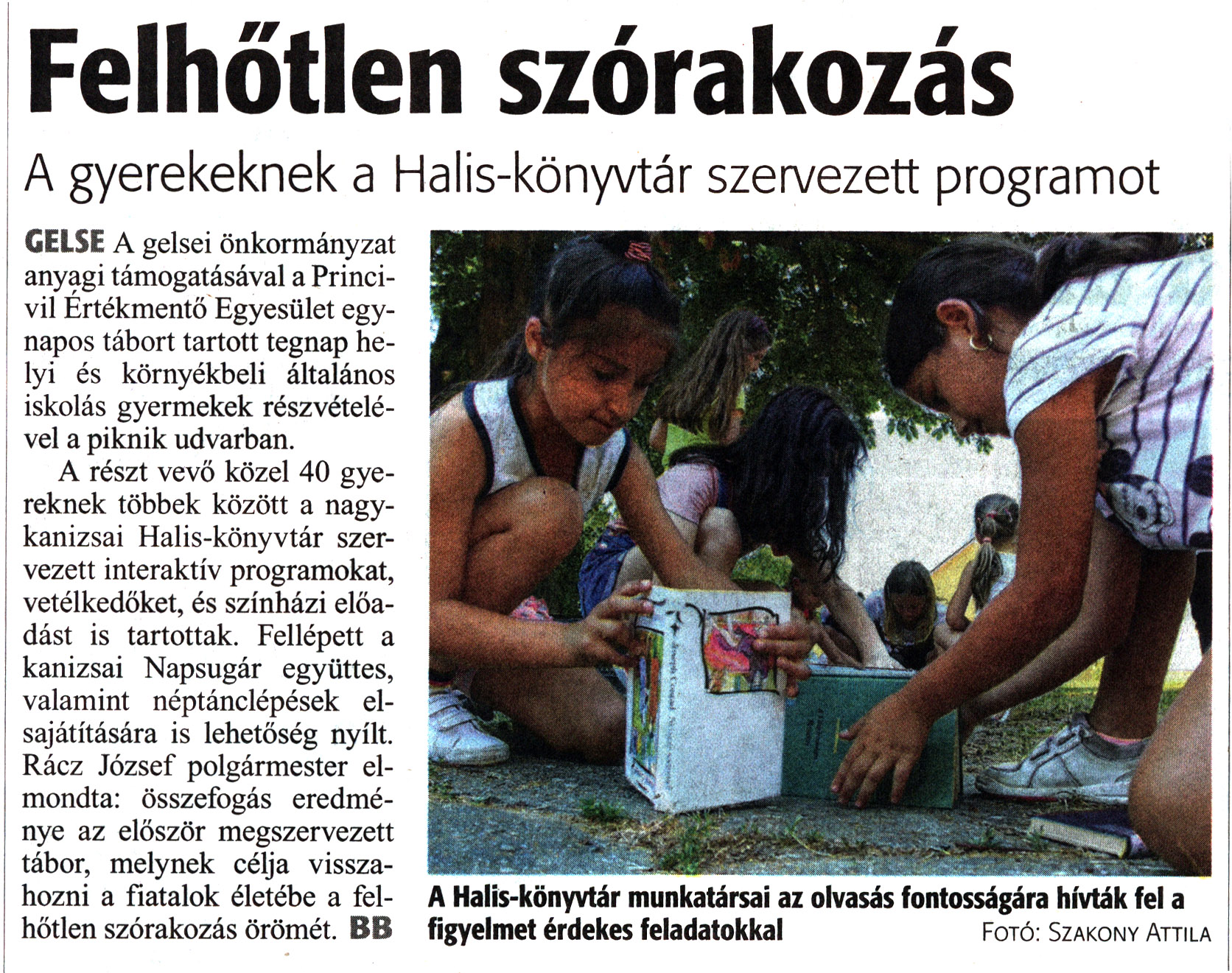 Nyilvános 1221 | 1735 | Zalai Hírlap 2021. július 8. 156. szám 16. oldal | Felhőtlen szórakozás A gyerekeknek a Halis-könyvtár szervezett programot GELSE A gelsei önkormányzat anyagi támogatásával a Princivil Értékmentő Egyesület egynapos tábort tartott tegnap helyi és környékbeli általános iskolás gyermekek részvételével a piknik udvarban. A Halis-könyvtár munkatársai az olvasás fontosságára hívták fel a figyelmet érdekes feladatokkal Fotó: Szakony Attila A részt vevő közel 40 gyereknek többek között a nagykanizsai Halis-könyvtár szervezett interaktív programokat, vetélkedőket, és színházi előadást is tartottak. Fellépett a kanizsai Napsugár együttes, valamint néptánclépések elsajátítására is lehetőség nyílt. Rácz József polgármester elmondta: összefogás eredménye az először megszervezett tábor, melynek célja visszahozni a fiatalok életébe a felhőtlen szórakozás örömét. BB |