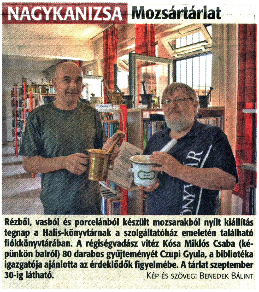 Nyilvános 1229 | 2792 | Zalai Hírlap 2021. július 30. 175. szám 3. oldal | Mozsártárlat Rézből, vasból és porcelánból készült mozsarakból nyílt kiállítás tegnap a Halis-könyvtárnak a szolgáltatóház emeletén található fiókkönyvtárában. A régiségvadász vitéz Kósa Miklós Csaba (képünkön balról) 80 darabos gyűjteményét Czupi Gyula, a bibliotéka igazgatója ajánlotta az érdeklődők figyelmébe. A tárlat szeptember 30-ig látható. Kép és szöveg: Benedek Bálint |