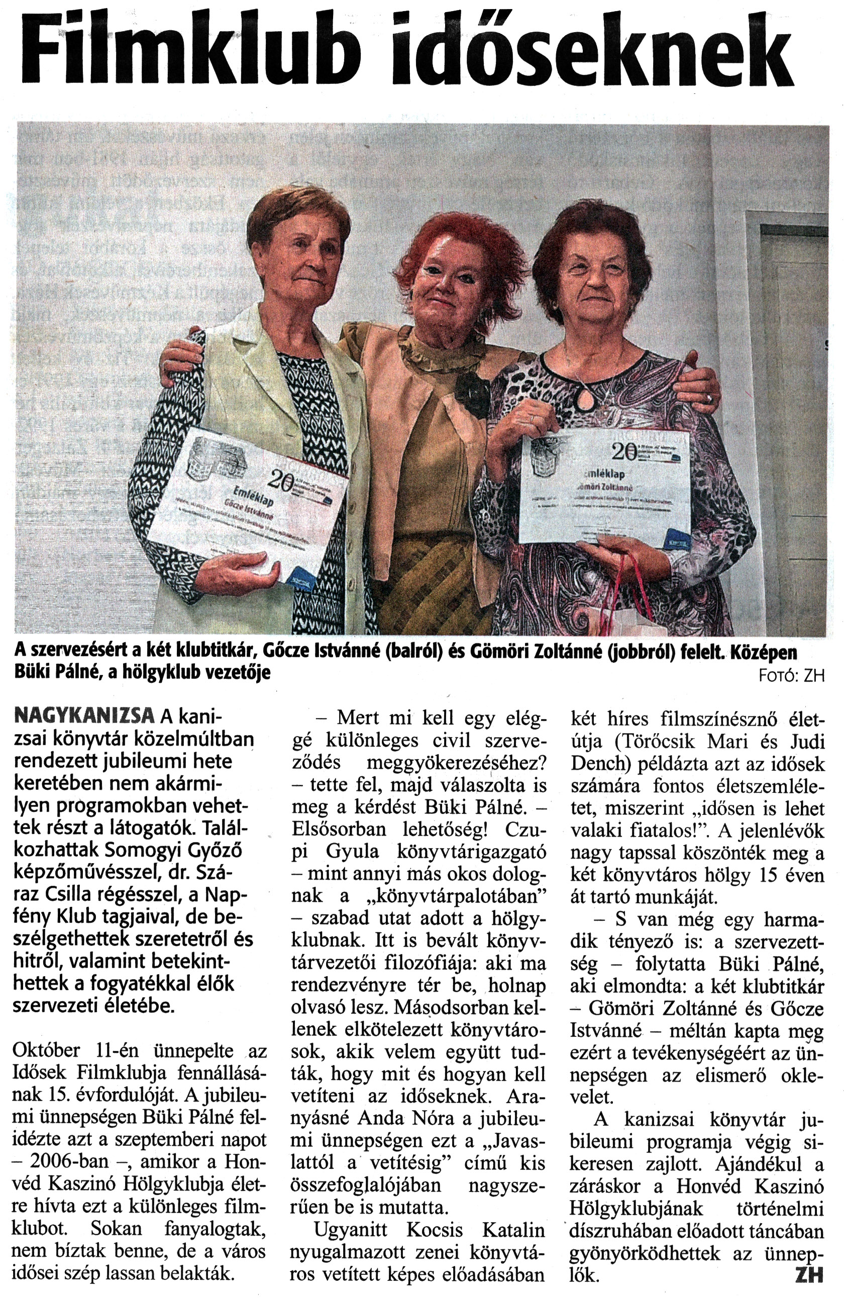 Nyilvános 1172 | 1681 | Zalai Hírlap 2021. október 15. 240. szám 12. oldal | Filmklub időseknek A szervezésért a két klubtitkár, Gőcze Istvánné (balról) és Gömöri Zoltánné (jobbról) felelt. Középen Büki Pálné, a hölgyklub vezetője Fotó: ZH NAGYKANIZSA A kanizsai könyvtár közelmúltban rendezett jubileumi hete keretében nem akármilyen programokban vehettek részt a látogatók. Találkozhattak Somogyi Győző képzőművésszel, dr. Száraz Csilla régésszel, a Napfény Klub tagjaival, de beszélgethettek szeretetről és hitről, valamint betekinthettek a fogyatékkal élők szervezeti életébe. Október 11-én ünnepelte az Idősek Filmklubja fennállásának 15. évfordulóját. A jubileumi ünnepségen Büki Pálné felidézte azt a szeptemberi napot - 2006-ban -, amikor a Honvéd Kaszinó Hölgyklubja életre hívta ezt a különleges filmklubot. Sokan fanyalogtak, nem bíztak benne, de a város idősei szép lassan belakták. - Mert mi kell egy eléggé különleges civil szerveződés meggyökerezéséhez? - tette fel, majd válaszolta is meg a kérdést Büki Pálné. - Elsősorban lehetőség! Czupi Gyula könyvtárigazgató - mint annyi más okos dolognak a „könyvtárpalotában" - szabad utat adott a hölgyklubnak. Itt is bevált könyvtárvezetői filozófiája: aki ma rendezvényre tér be, holnap olvasó lesz. Másodsorban kellenek elkötelezett könyvtárosok, akik velem együtt tudták, hogy mit és hogyan kell vetíteni az időseknek. Aranyásné Anda Nóra a jubileumi ünnepségen ezt a „Javaslattól a vetítésig" című kis összefoglalójában nagyszerűen be is mutatta. Ugyanitt Kocsis Katalin nyugalmazott zenei könyvtáros vetített képes előadásában két híres filmszínésznő életútja (Törőcsik Mari és Judi Dench) példázta azt az idősek számára fontos életszemléletet, miszerint „idősen is lehet valaki fiatalos!". A jelenlévők nagy tapssal köszönték meg a két könyvtáros hölgy 15 éven át tartó munkáját. - S van még egy harmadik tényező is: a szervezettség - folytatta Büki Pálné, aki elmondta: a két klubtitkár - Gömöri Zoltánné és Gőcze Istvánné - méltán kapta meg ezért a tevékenységéért az ünnepségen az elismerő oklevelet. A kanizsai könyvtár jubileumi programja végig sikeresen zajlott. Ajándékul a záráskor a Honvéd Kaszinó Hölgyklubjának történelmi díszruhában előadott táncában gyönyörködhettek az ünneplők. ZH |