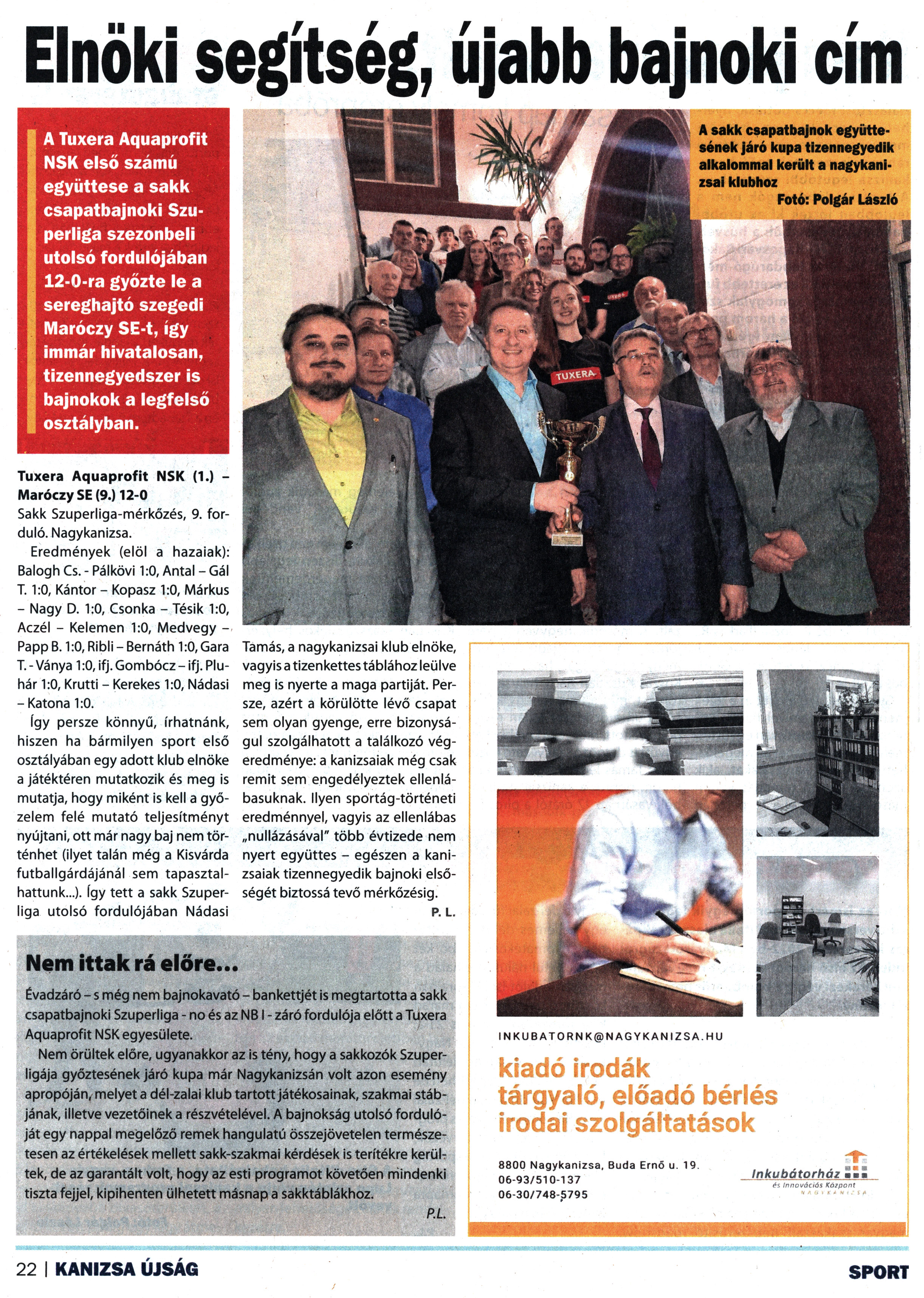 Nyilvános 1233 | 1540 | Kanizsa 2022. április 22. 8. szám 22. oldal | A Tuxera Aquaprofit NSK első számú együttese a sakk csapatbajnoki Szuperliga szezonbeli utolsó fordulójában 12-0-ra győzte le a sereghajtó szegedi Maróczy SE-t, így immár hivatalosan, tizennegyedszer is bajnokok a legfelső osztályban. 19. Elnöki segítség, újabb bajnoki cím Nem ittak rá előre... Tuxera Aquaprofit NSK (1.) -Maróczy SE (9.) 12-0 Sakk Szuperliga-mérkőzés, 9. forduló. Nagykanizsa. Eredmények (elöl a hazaiak): Balogh Cs. - Pálkövi 1:0, Antal - Gál T. 1:0, Kántor - Kopasz 1:0, Márkus - Nagy D. 1:0, Csonka - Tésik 1:0, Aczél - Kelemen 1:0, Medvegy -Papp B. 1:0, Ribli - Bernáth 1:0, Gara T. - Ványa 1:0, ifj. Gombócz - ifj. Plu-hár 1:0, Krutti - Kerekes 1:0, Nádasi -Katona 1:0. így persze könnyű, írhatnánk, hiszen ha bármilyen sport első osztályában egy adott klub elnöke a játéktéren mutatkozik és meg is mutatja, hogy miként is kell a győzelem felé mutató teljesítményt nyújtani, ott már nagy baj nem történhet (ilyet talán még a Kisvárda futballgárdájánál sem tapasztalhattunk...). így tett a sakk Szuperliga utolsó fordulójában Nádasi Tamás, a nagykanizsai klub elnöke, vagyis a tizenkettes táblához leülve meg is nyerte a maga partiját. Persze, azért a körülötte lévő csapat sem olyan gyenge, erre bizonyságul szolgálhatott a találkozó végeredménye: a kanizsaiak még csak remit sem engedélyeztek ellenlábasuknak. Ilyen sportág-történeti eredménnyel, vagyis az ellenlábas „nullázásával" több évtizede nem nyert együttes - egészen a kanizsaiak tizennegyedik bajnoki elsőségét biztossá tevő mérkőzésig. P. L. Évadzáró - s még nem bajnokavató - bankettjét is megtartotta a sakk csapatbajnoki Szuperliga - no és az NBI - záró fordulója előtt a Tuxera Aquaprofit NSK egyesülete. Nem örültek előre, ugyanakkor az is tény, hogy a sakkozók Szuperligája győztesének járó kupa már Nagykanizsán volt azon esemény apropóján, melyet a dél-zalai klub tartott játékosainak, szakmai stábjának, illetve vezetőinek a részvételével. A bajnokság utolsó fordulóját egy nappal megelőző remek hangulatú összejövetelen természetesen az értékelések mellett sakk-szakmai kérdések is terítékre került tek, de az garantált volt, hogy az esti programot követően mindenki tiszta fejjel, kipihenten ülhetett másnapa sakktáblákhoz. Pl. A sakk csapatbajnok együttesének járó kupa tizennegyedik alkalommal került a nagykanizsai klubhoz Fotó: Polgár László |