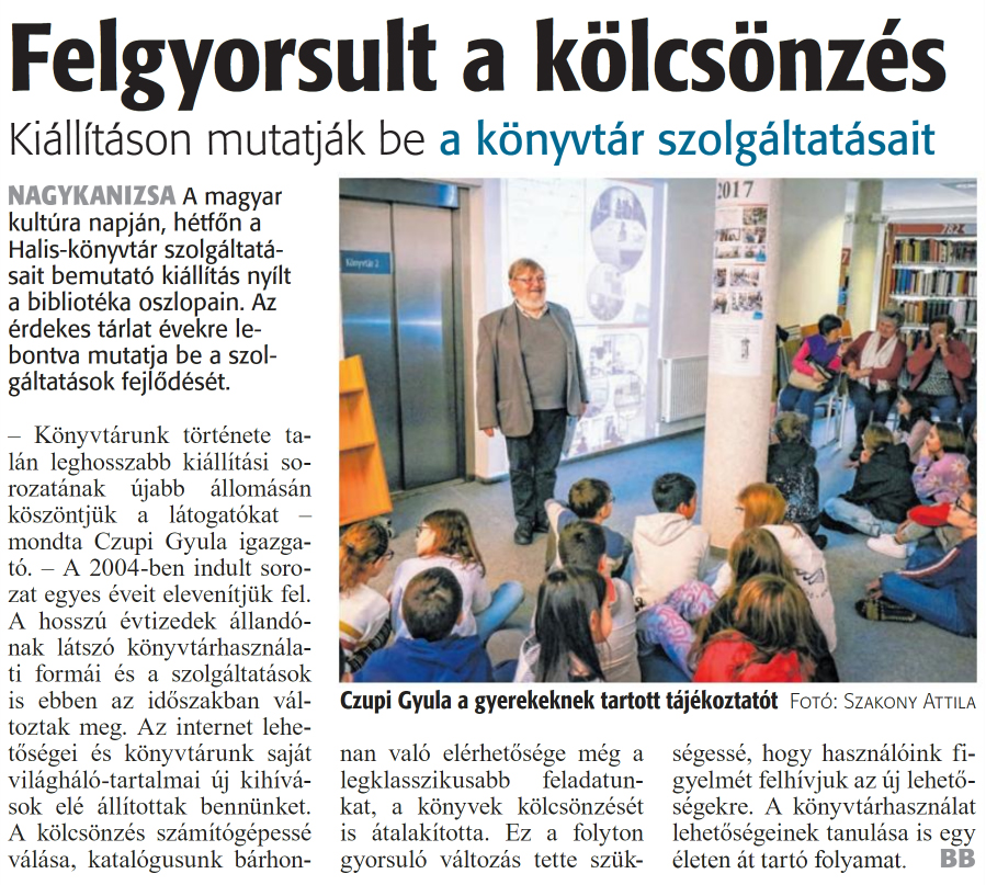 Nyilvános 977 | 1471 | Zalai Hírlap 2024. január 23. 19. szám 16. oldal | Felgyorsult a kölcsönzés Kiállításon mutatják be a könyvtár szolgáltatásait NAGYKANIZSA A magyar kultúra napján, hétfőn a Halis-könyvtár szolgáltatásait bemutató kiállítás nyílt a bibliotéka oszlopain. Az érdekes tárlat évekre lebontva mutatja be a szolgáltatások fejlődését. - Könyvtárunk története talán leghosszabb kiállítási sorozatának újabb állomásán köszöntjük a látogatókat -mondta Czupi Gyula igazgató. - A 2004-ben indult sorozat egyes éveit elevenítjük fel. A hosszú évtizedek állandónak látszó könyvtárhasználati formái és a szolgáltatások is ebben az időszakban változtak meg. Az internet lehetőségei és könyvtárunk saját világháló-tartalmai új kihívások elé állítottak bennünket. A kölcsönzés számítógépessé válása, katalógusunk bárhonnan való elérhetősége még a legklasszikusabb feladatunkat, a könyvek kölcsönzését is átalakította. Ez a folyton gyorsuló változás tette szükségessé, hogy használóink figyelmét felhívjuk az új lehetőségekre. A könyvtárhasználat lehetőségeinek tanulása is egy életen át tartó folyamat. BB Czupi Gyula a gyerekeknek tartott tájékoztatót Fotó: Szakony Attila |