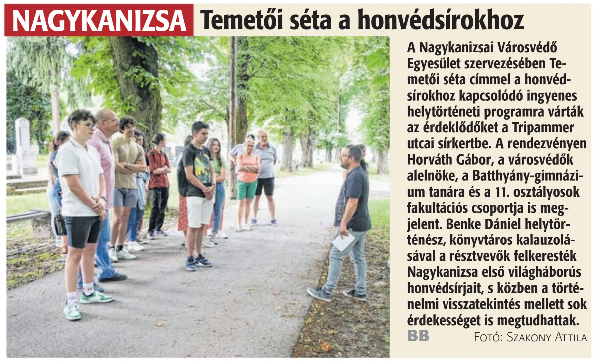 Nyilvános 872 | 1157 | Zalai Hírlap 2024. június 11. 134. szám 16. oldal | Temetői séta a honvédsírokhoz NAGYKANIZSA A Nagykanizsai Városvédő Egyesület szervezésében Temetői séta címmel a honvédsírokhoz kapcsolódó ingyenes helytörténeti programra várták az érdeklődőket a Tripammer utcai sírkertbe. A rendezvényen Horváth Gábor, a városvédők alelnöke, a Batthyány-gimnázium tanára és a 11. osztályosok fakultációs csoportja is megjelent. Benke Dániel helytörténész, könyvtáros kalauzolásával a résztvevők felkeresték Nagykanizsa első világháborús honvédsírjait, s közben a történelmi visszatekintés mellett sok érdekességet is megtudhattak. BB Fotó: Szakony Attila |