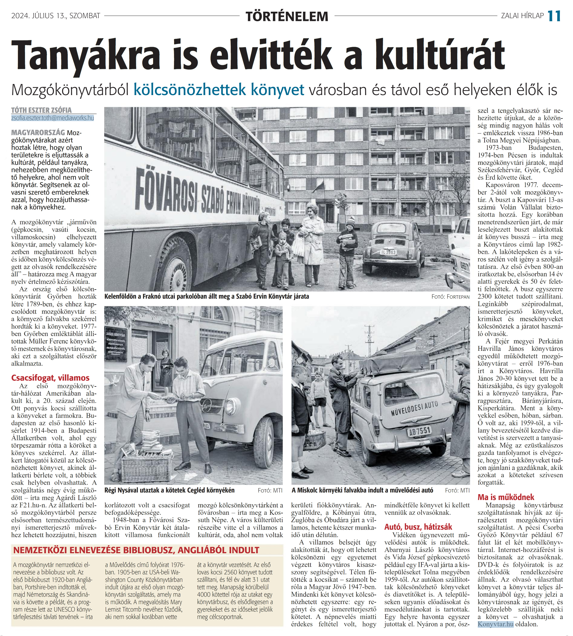 Nyilvános 913 | 1131 | Zalai Hírlap 2024. július 13. 162. szám 11. oldal | Tanyákra is elvitték a kultúrát Mozgókönyvtárból kölcsönözhettek könyvet városban és távol eső helyeken élők is TÓTH ESZTER ZSÓFIA zsofia.eszter.toth@mediaworks.hu MAGYARORSZÁG Mozgókönyvtárakat azért hoztak létre, hogy olyan területekre is eljuttassák a kultúrát, például tanyákra, nehezebben megközelíthető helyekre, ahol nem volt könyvtár. Segítsenek az olvasni szerető embereknek azzal, hogy hozzájuthassanak a könyvekhez. A mozgókönyvtár „járművön (gépkocsin, vasúti kocsin, villamoskocsin) elhelyezett könyvtár, amely valamely körzetben meghatározott helyen és időben könyvkölcsönzés végett az olvasók rendelkezésére áll" - határozza meg A magyar nyelv értelmező kéziszótára. Az ország első kölcsön-könyvtárát Győrben hozták létre 1789-ben, és ehhez kapcsolódott mozgókönyvtár is: a környező falvakba szekérrel hordták ki a könyveket. 1977-ben Győrben emléktáblát állítottak Müller Ferenc könyvkötő mesternek és könyvtárosnak, aki ezt a szolsáltatást először alkalmazta. Az első mozgókönyvtár-hálózat Amerikában alakult ki, a 20. század elején. Ott ponyvás kocsi szállította a könyveket a farmokra. Budapesten az első hasonló kísérlet 1914-ben a Budapesti Állatkertben volt, ahol egy törpeszamár rótta a köröket a könyves szekérrel. Az állatkert látogatói közül az kölcsönözhetett könyvet, akinek állatkerti bérlete volt, a többiek csak helyben olvashattak. A szolgáltatás négy évig működött - írta meg Agárdi László az F21.hu-n. Az állatkerti belső mozgókönyvtárból persze elsősorban természettudományi ismeretterjesztő müvekhez lehetett hozzájutni, hiszen korlátozott volt a csacsifogat befogadóképessége. 1948-ban a Fővárosi Szabó Ervin Könyvtár két átalakított villamosa funkcionált mozgó kölcsönkönyvtárként a fővárosban - írta meg a Kossuth Népe. A város külterületi részeibe vitte el a villamos a kultúrát, oda, ahol nem voltak kerületi fiókkönyvtárak. Angyalföldre, a Kőbányai útra, Zuglóba és Óbudára járt a villamos, hetente kétszer munkaidő után délután. A villamos belsejét úgy alakították át, hogy ott lehetett kölcsönözni egy egyetemet végzett könyvtáros kisasszony segítségével. Télen fűtötték a kocsikat - számolt be róla a Magyar Jövő 1947-ben. Mindenki két könyvet kölcsönözhetett egyszerre: egy regényt és egy ismeretterjesztő kötetet. A népnevelés miatti érdekes feltétel volt, hogy mindkétféle könyvet ki kellett venniük az olvasóknak. Vidéken úgynevezett művelődési autók is működtek. Abarnyai László könyvtáros és Vida József gépkocsivezető például egy IFA-val járta a kistelepüléseket Tolna megyében 1959-től. Az autókon szállítottak kölcsönözhető könyveket és diavetítőket is. A településeken ugyanis előadásokat és mesedélutánokat is tartottak. Egy helyre havonta egyszer jutottak el. Nyáron a por, ősszel a tengelyakasztó sár nehezítette útjukat, de a közönség mindig nagyon hálás volt - emlékeztek vissza 1986-ban a Tolna Megyei Népújságban. 1973-ban Budapesten, 1974-ben Pécsen is indultak mozgókönyvtári járatok, majd Székesfehérvár, Győr, Cegléd és Érd követte őket. Kaposváron 1977. december 2-ától volt mozgókönyvtár. A buszt a Kaposvári 13-as számú Volán Vállalat biztosította hozzá. Egy korábban menetrendszerűen járt, de már leselejtezett buszt alakítottak át könyves busszá - írta meg a Könyvtáros című lap 1982-ben. A lakótelepeken és a város szélén volt igény a szolgáltatásra. Az első évben 800-an iratkoztak be, elsősorban 14 év alatti gyerekek és 50 év feletti felnőttek. A busz egyszerre 2300 kötetet tudott szállítani. Leginkább szépirodalmat, ismeretterjesztő könyveket, krimiket és mesekönyveket kölcsönöztek a járatot használó olvasók. A Fejér megyei Perkátán Havrilla János könyvtáros egyedül működtetett mozgókönyvtárat - erről 1976-ban írt a Könyvtáros. Havrilla János 20-30 könyvet tett be a hátizsákjába, és úgy gyalogolt ki a környező tanyákra, Parragpusztára, Bárányjárásra, Kisperkátára. Ment a könyvekkel esőben, hóban, sárban. Ő volt az, aki 1959-től, a villany bevezetésétől kezdve diavetítést is szervezett a tanyasiaknak. Még az ezüstkalászos gazda tanfolyamot is elvégezte, hogy jó szakkönyveket tudjon ajánlani a gazdáknak, akik azokat a köteteket szívesen forgatták. Ma is működnek Manapság könyvtárbusz szolgáltatásnak hívják az újraélesztett mozgókönyvtári szolgáltatást. A pécsi Csorba Győző Könyvtár például 67 falut lát el két mobilkönyvtárral. Internet-hozzáférést is biztosítanak az olvasóknak. DVD-k és folyóiratok is az érdeklődők rendelkezésére állnak. Az olvasó választhat könyvet a könyvtár teljes állományából úgy, hogy jelzi a könyvtárosnak az igényét, és legközelebb szállítják neki a könyvet - olvashatjuk a Konyvtar.hu oldalon. NEMZETKÖZI ELNEVEZÉSE BIBLIOBUSZ, ANGLIÁBÓL INDULT A mozgókönyvtár nemzetközi elnevezése a bibliobusz volt. Az első bibliobuszt 1920-ban Angliában, Portshire-ben indították el, majd Németország és Skandinávia is követte a példát, és a program része lett az UNESCO könyvtárfejlesztési távlati tervének - írta a Művelődés című folyóirat 1976-ban. 1905-ben az USA-beli Washington County Közkönyvtárban indult útjára az első olyan mozgókönyvtári szolgáltatás, amely ma is működik. A megvalósítás Mary Lemist Titcomb nevéhez fűződik, aki nem sokkal korábban vette át a könyvtár vezetését. Az első lovas kocsi 2560 könyvet tudott szállítani, és fél év alatt 31 utat tett meg. Manapság körülbelül 4000 kötettel rója az utakat egy könyvtárbus