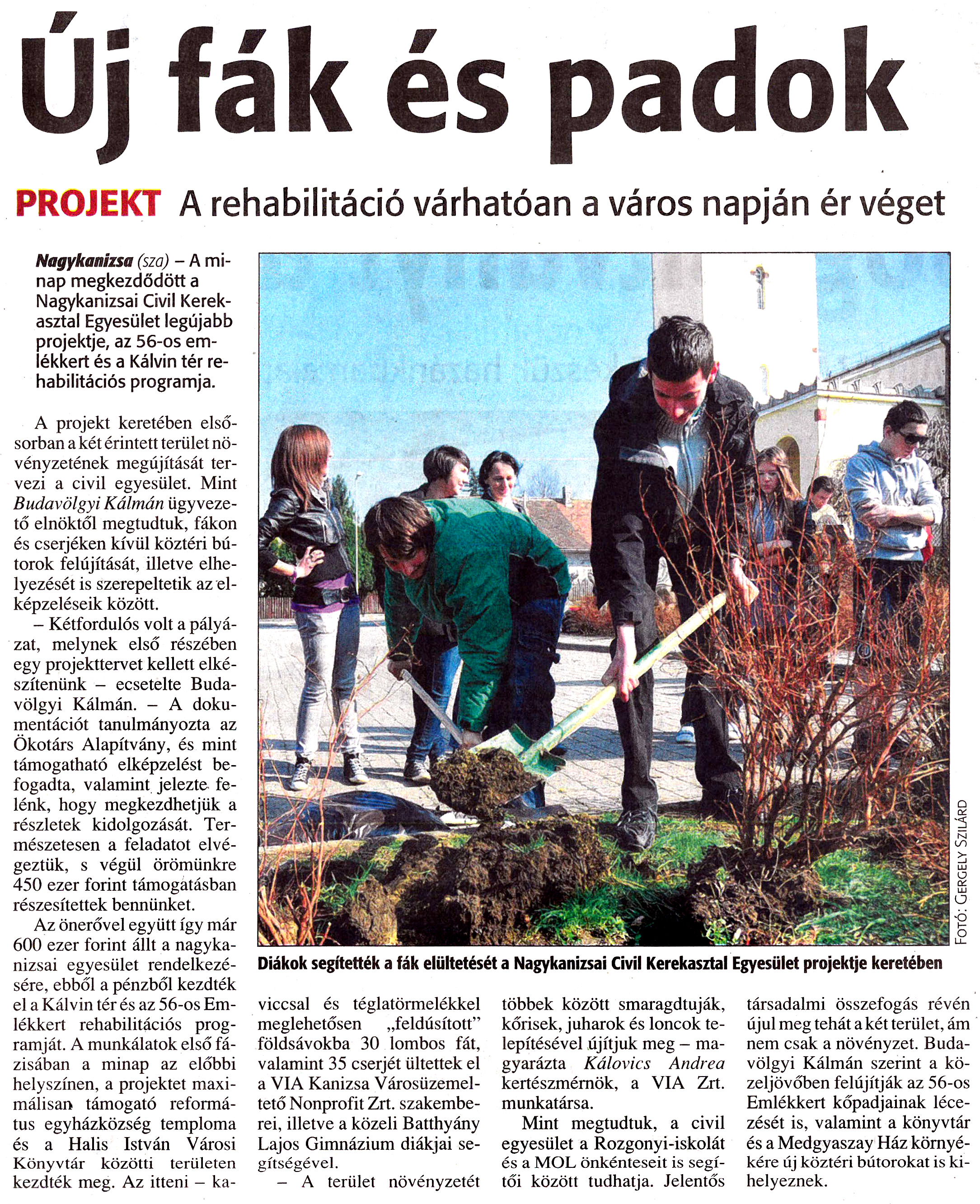 Nyilvános 991 | 1408 | Zalai Hírlap 2011. április 1. 76. szám 11. oldal | Új fák és padok PROJEKT A rehabilitáció várhatóan a város napján ér véget Diákok segítették a fák elültetését a Nagykanizsai Civil Kerekasztal Egyesület projektje keretében Nagykanizsa (sza) - A minap megkezdődött a Nagykanizsai Civil Kerekasztal Egyesület legújabb projektje, az 56-os emlékkert és a Kálvin tér rehabilitációs programja. A projekt keretében elsősorban a két érintett terület növényzetének megújítását tervezi a civil egyesület. Mint Budavölgyi Kálmán ügyvezető elnöktől megtudtuk, fákon és cserjéken kívül köztéri bútorok felújítását, illetve elhelyezését is szerepeltetik az elképzeléseik között. - Kétfordulós volt a pályázat, melynek első részében egy projekttervet kellett elkészítenünk - ecsetelte Budavölgyi Kálmán. - A dokumentációt tanulmányozta az Ökotárs Alapítvány, és mint támogatható elképzelést befogadta, valamint jelezte felénk, hogy megkezdhetjük a részletek kidolgozását. Természetesen a feladatot elvégeztük, s végül örömünkre 450 ezer forint támogatásban részesítettek bennünket. Az önerővel együtt így már 600 ezer forint állt a nagykanizsai egyesület rendelkezésére, ebből a pénzből kezdték el a Kálvin tér és az 56-os Emlékkert rehabilitációs programját. A munkálatok első fázisában a minap az előbbi helyszínen, a projektet maximálisan támogató református egyházközség temploma és a Halis István Városi Könyvtár közötti területen kezdték meg. Az itteni - ka- viccsal és téglatörmelékkel meglehetősen „feldúsított" földsávokba 30 lombos fát, valamint 35 cserjét ültettek el a VIA Kanizsa Városüzemeltető Nonprofit Zrt. szakemberei, illetve a közeli Batthyány Lajos Gimnázium diákjai segítségével. - A terület növényzetét többek között smaragdtuják, kőrisek, juharok és loncok telepítésével újítjuk meg - magyarázta Kálovics Andrea kertészmérnök, a VIA Zrt. munkatársa. Mint megtudtuk, a civil egyesület a Rozgonyi-iskolát és a MOL önkénteseit is segítői között tudhatja. Jelentős társadalmi összefogás révén újul meg tehát a két terület, ám nem csak a növényzet. Budavölgyi Kálmán szerint a közeljövőben felújítják az 56-os Emlékkert kőpadjainak lécezését is, valamint a könyvtár és a Medgyaszay Ház környékére új köztéri bútorokat is kihelyeznek. |