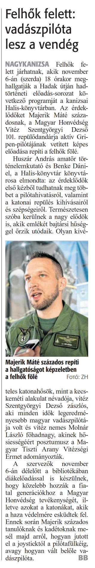 Nyilvános 873 | 1094 | Zalai Hírlap 2024. október 31. 254. szám 6. oldal | Felhők felett: vadászpilóta lesz a vendég NAGYKANIZSA Felhők felett járhatnak, akik november 6-án (szerda) 18 órakor meghallgatják a Hadak útján hadtörténeti előadás-sorozat következő programját a kanizsai Halis-könyvtárban. Az érdeklődőket Majerik Máté századosnak, a Magyar Honvédség Vitéz Szentgyörgyi Dezső 101. repülődandárja aktív Gripen-pilótájának vetített képes előadása repíti a felhők fölé. Huszár András amatőr történelemkutató és Benke Dániel, a Halis-könyvtár könyvtárosa elmondta: az érdeklődők első kézből tudhatnak meg többet a pilótahivatásról, valamint a katonai repülés kihívásairól és szépségeiről. Természetesen szóba kerülnek a nagy elődök is, akik emlékét bajtársi hűséggel őrzik utódaik. Olyan kivételes katonahősök, mint a kecskeméti alakulat névadója, vitéz Szentgyörgyi Dezső zászlós, aki minden idők legeredményesebb magyar vadászpilótája volt és vitéz nemes Molnár László főhadnagy, akinek hősiességéért posztumusz a Magyar Tiszti Arany Vitézségi Érmet adományozták. A szervezők november 6-án délelőtt a bibliotékában diákelőadással is készülnek, hogy közelebb hozzák a fiatal generációkhoz a Magyar Honvédség tevékenységét, illetve azokat a katonákat, akik a haza védelmére esküdtek fel. Ennek során Majerik százados tanulóknak és kadétoknak mesél majd arról, hogyan jutott el a joysticktói a pilótafülkéig, avagy hogyan vált belőle vadászpilóta. BB |