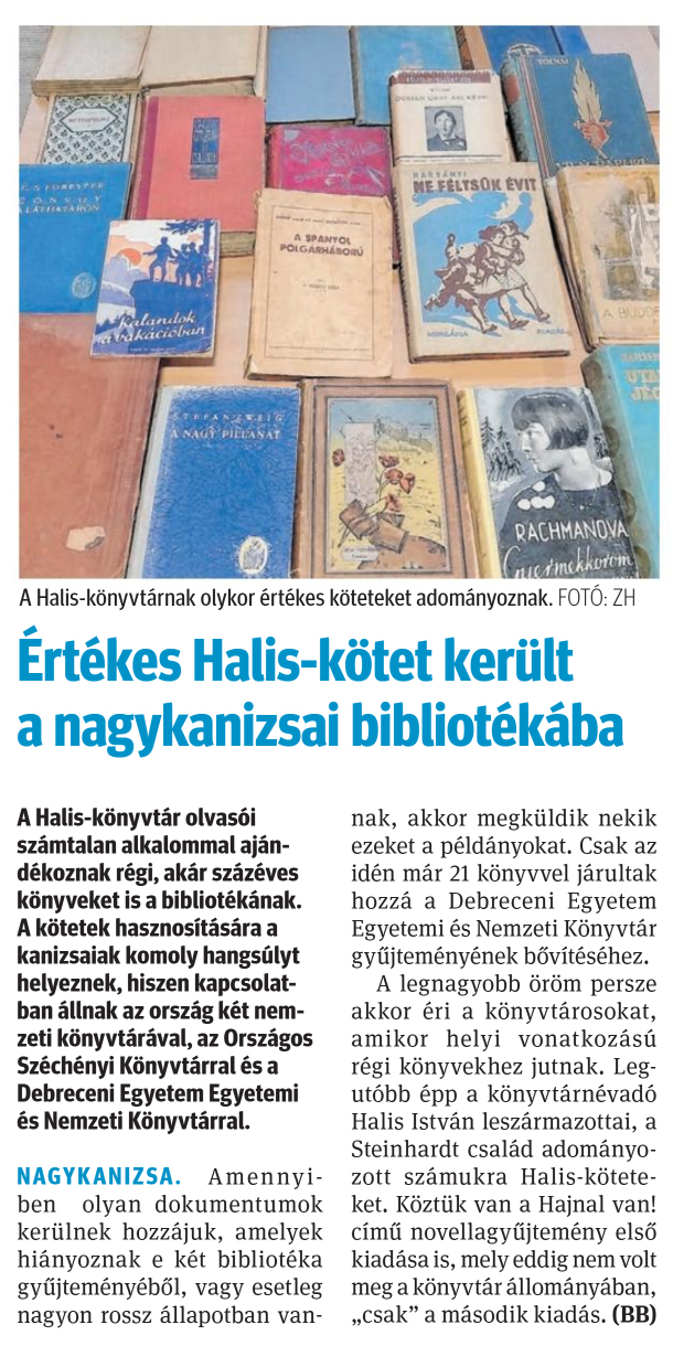 Nyilvános 808 | 1071 | Zalai Hírlap 2025. február 24. 46. szám 16. oldal | A Halis-könyvtárnak olykor értékes köteteket adományoznak. FOTÓ: ZH Értékes Halis-kötet került a nagykanizsai bibliotékába A Halis-könyvtár olvasói számtalan alkalommal ajándékoznak régi, akár százéves könyveket is a bibliotékának. A kötetek hasznosítására a kanizsaiak komoly hangsúlyt helyeznek, hiszen kapcsolatban állnak az ország két nemzeti könyvtárával, az Országos Széchényi Könyvtárral és a Debreceni Egyetem Egyetemi és Nemzeti Könyvtárral. NAGYKANIZSA. Amennyiben olyan dokumentumok kerülnek hozzájuk, amelyek hiányoznak e két bibliotéka gyűjteményéből, vagy esetleg nagyon rossz állapotban vannak, akkor megküldik nekik ezeket a példányokat. Csak az idén már 21 könyvvel járultak hozzá a Debreceni Egyetem Egyetemi és Nemzeti Könyvtár gyűjteményének bővítéséhez. A legnagyobb öröm persze akkor éri a könyvtárosokat, amikor helyi vonatkozású régi könyvekhez jutnak. Legutóbb épp a könyvtárnévadó Halis István leszármazottai, a Steinhardt család adományozott számukra Halis-köteteket. Köztük van a Hajnal van! című novellagyűjtemény első kiadása is, mely eddig nem volt meg a könyvtár állományában, „csak" a második kiadás. (BB) |