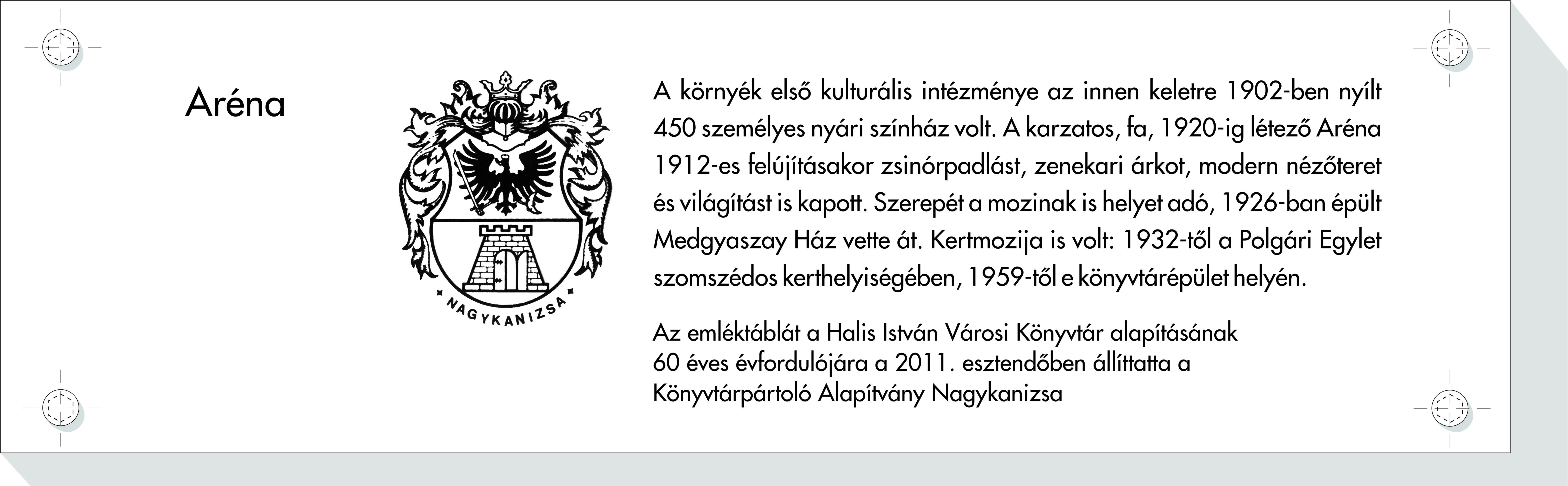 Nyilvános 1799 | 4476 | Aréna | A környék első kulturális intézménye az innen keletre 1902-ben nyílt 450 személyes nyári színház volt. A karzatos, fa, 1920-ig létező Aréna 1912-es felújításakor zsinórpadlást, zenekari árkot, modern nézőteret és világítást is kapott. Szerepét a mozinak is helyet adó, 1926-ban épült Medgyaszay Ház vette át. Kertmozija is volt: 1932-től a Polgári Egylet szomszédos kerthelyiségében, 1959-től e könyvtárépület helyén. Az emléktáblát a Halis István Városi Könyvtár alapításának 60 éves évfordulójára a 2011. esztendőben állíttatta a Könyvtárpártoló Alapítvány Nagykanizsa |