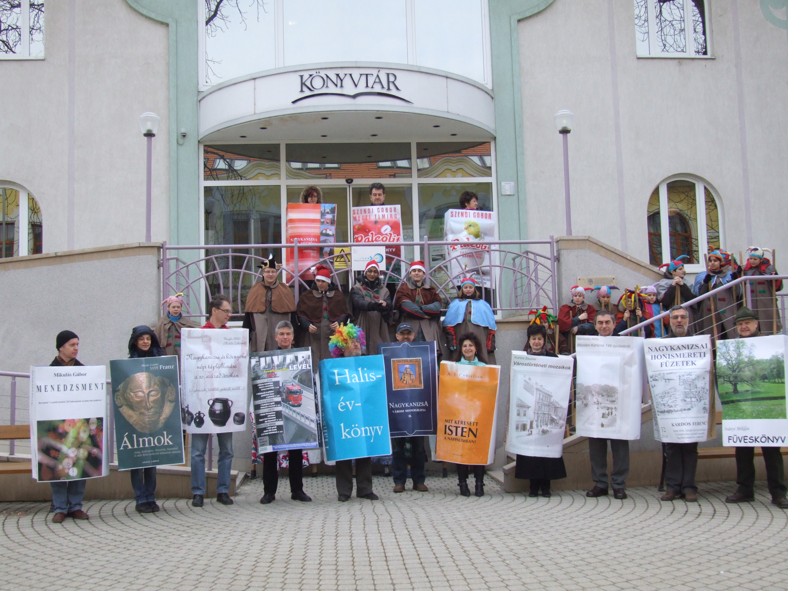 Nyilvános 1381 | 2960 | 2013. február 9. A farsangi fánkfesztiválra készülve felhívásban kértük olvasóinkat, hogy öltsék magukra kedves könyvüket. Egy „könyvespolcnyi” jelentkező vette magára kedves olvasmányát, az ő vonulásukról készültek ezek a képek. A környezetükben néhol láthatók a Nagykanizsai Gólyalábasok, akik szintén a könyvtárhoz kötődnek. A „felvonuló kötetek” a könyvtár épületében még megtekinthetők. | |