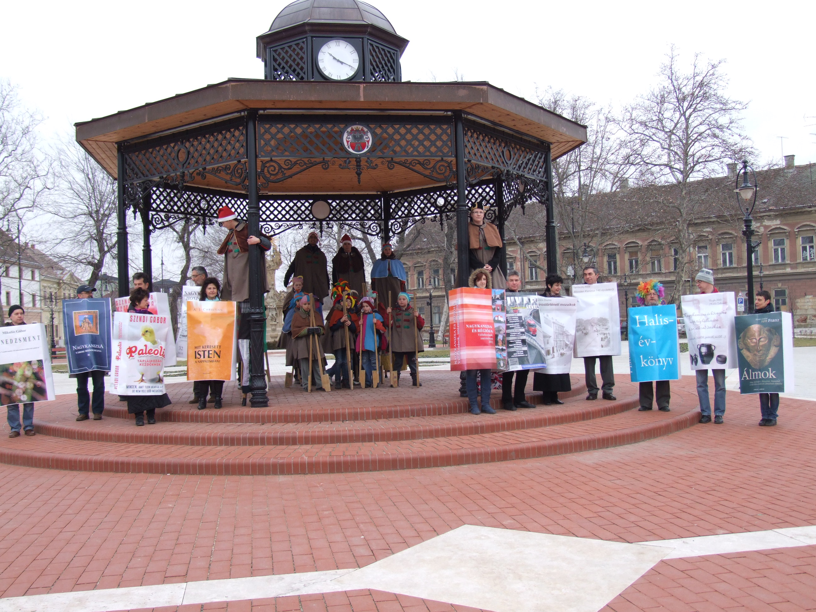 Nyilvános 1068 | 1600 | 2013. február 9. A farsangi fánkfesztiválra készülve felhívásban kértük olvasóinkat, hogy öltsék magukra kedves könyvüket. Egy „könyvespolcnyi” jelentkező vette magára kedves olvasmányát, az ő vonulásukról készültek ezek a képek. A környezetükben néhol láthatók a Nagykanizsai Gólyalábasok, akik szintén a könyvtárhoz kötődnek. A „felvonuló kötetek” a könyvtár épületében még megtekinthetők. | |