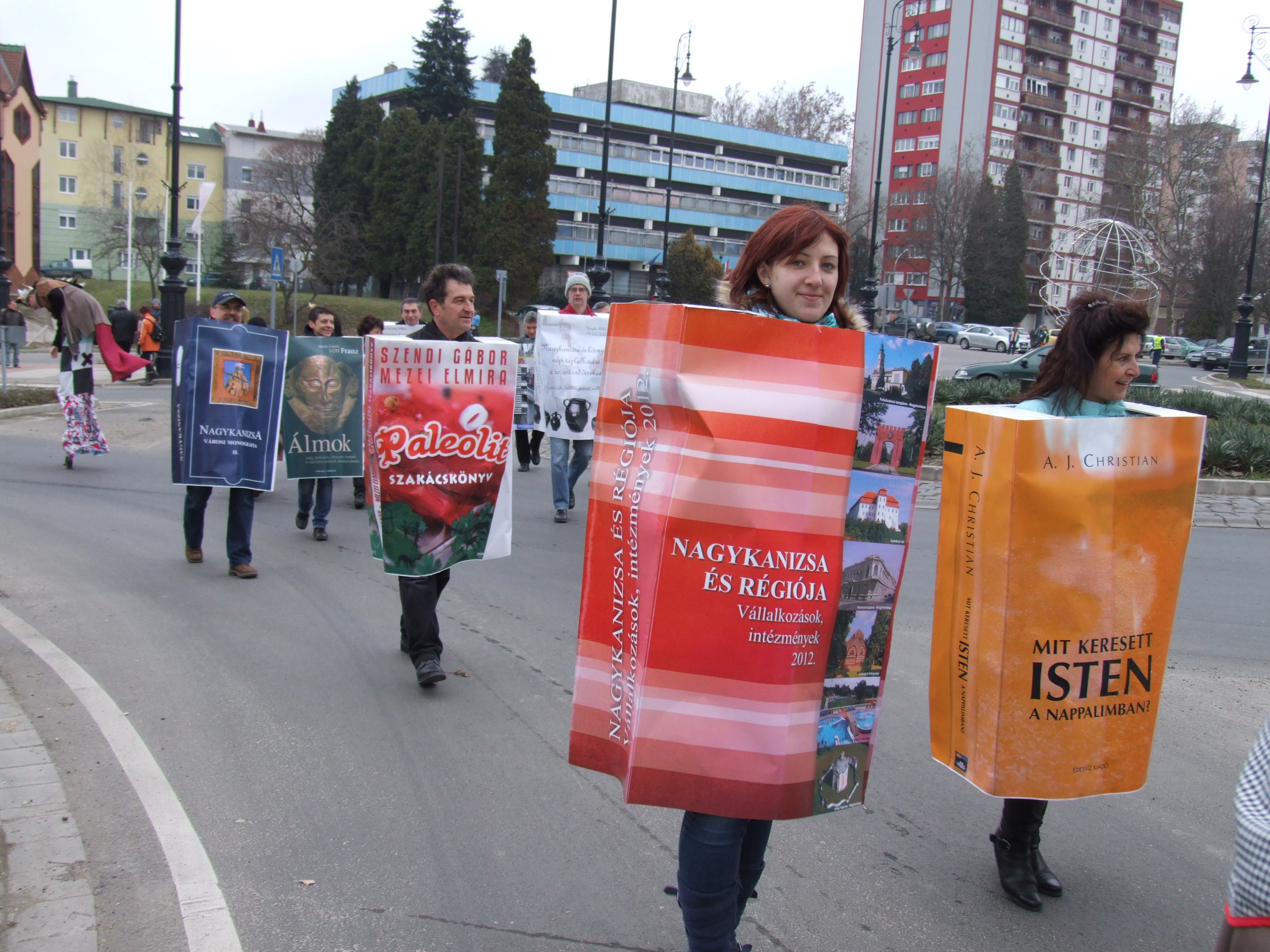 Nyilvános 1022 | 1442 | 2013. február 9. A farsangi fánkfesztiválra készülve felhívásban kértük olvasóinkat, hogy öltsék magukra kedves könyvüket. Egy „könyvespolcnyi” jelentkező vette magára kedves olvasmányát, az ő vonulásukról készültek ezek a képek. A környezetükben néhol láthatók a Nagykanizsai Gólyalábasok, akik szintén a könyvtárhoz kötődnek. A „felvonuló kötetek” a könyvtár épületében még megtekinthetők. | |