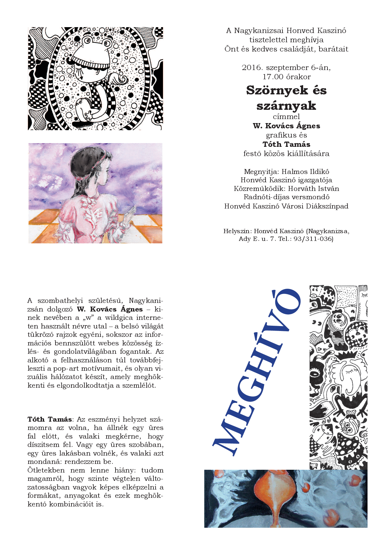 Nyilvános 1095 | 1935 | MEGHÍVÓ | A szombathelyi születésű, Nagykanizsán dolgozó W. Kovács Ágnes – kinek nevében a „w” a wildgica interneten használt névre utal – a belső világát tükröző rajzok egyéni, sokszor az információs bennszülött webes közösség ízlés- és gondolatvilágában fogantak. Az alkotó a felhasználáson túl továbbfejleszti a pop-art motívumait, és olyan vizuális hálózatot készít, amely meghökkenti és elgondolkodtatja a szemlélőt. Tóth Tamás: Az eszményi helyzet számomra az volna, ha állnék egy üres fal előtt, és valaki megkérne, hogy díszitsem fel. Vagy egy üres szobában, egy üres lakásban volnék, és valaki azt mondaná: rendezzem be. Ötletekben nem lenne hiány: tudom magamról, hogy szinte végtelen változatosságban vagyok képes elképzelni a formákat, anyagokat és ezek meghökkentő kombinációit is. A Nagykanizsai Honved Kaszinó tisztelettel meghívja Önt és kedves családját, barátait 2016. szeptember 6-án, 17.00 órakor Szörnyek és szárnyak címmel W. Kovács Ágnes grafikus és Tóth Tamás festő közös kiállítására Megnyitja: Halmos Ildikó Honvéd Kaszinó igazgatója Közreműködik: Horváth István Radnóti-díjas versmondó Honvéd Kaszinó Városi Diákszínpad Helyszín: Honvéd Kaszinó (Nagykanizsa, Ady E. u. 7. Tel.: 93/311-036) |