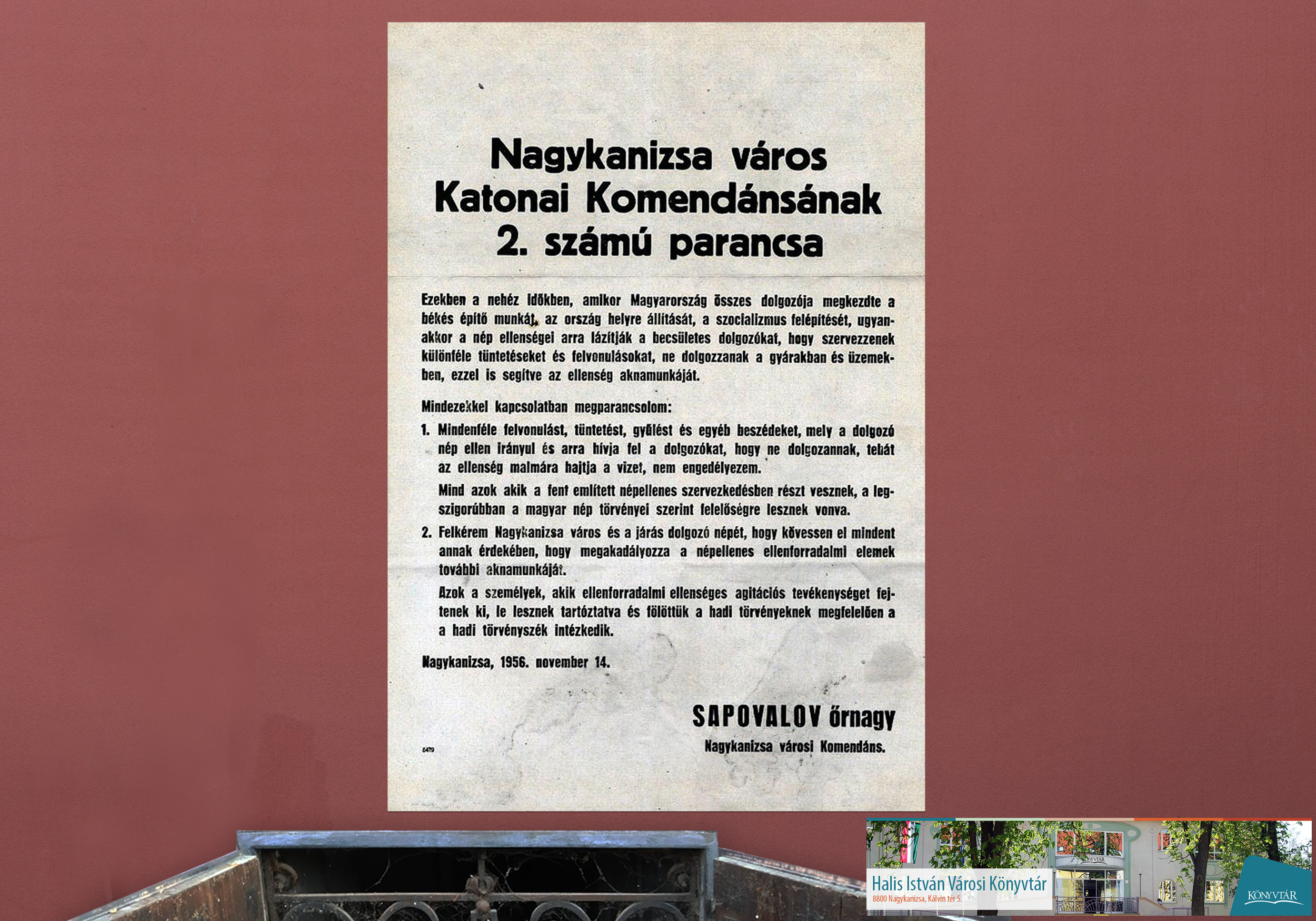 Nyilvános 1815 | 2107 | Egy kiállítás utolsó képe | Az 1956. november 14-én megjelent plakát megmutatása a zárása az október 23-a tiszteletére készült kiállításunknak. Az utolsó dokumentum már a későbbi időszakból ismert ellenségképet rajzolja fel. Tíz nappal a forradalom leverése után hadi állapotnak megfelelő eljárással fenyeget a megszálló hadsereg képviselője. Itt köszönünk el a korabeli történésektől és ezekkel a gondolatokkal a könyvtári emlékező kiállítástól. |