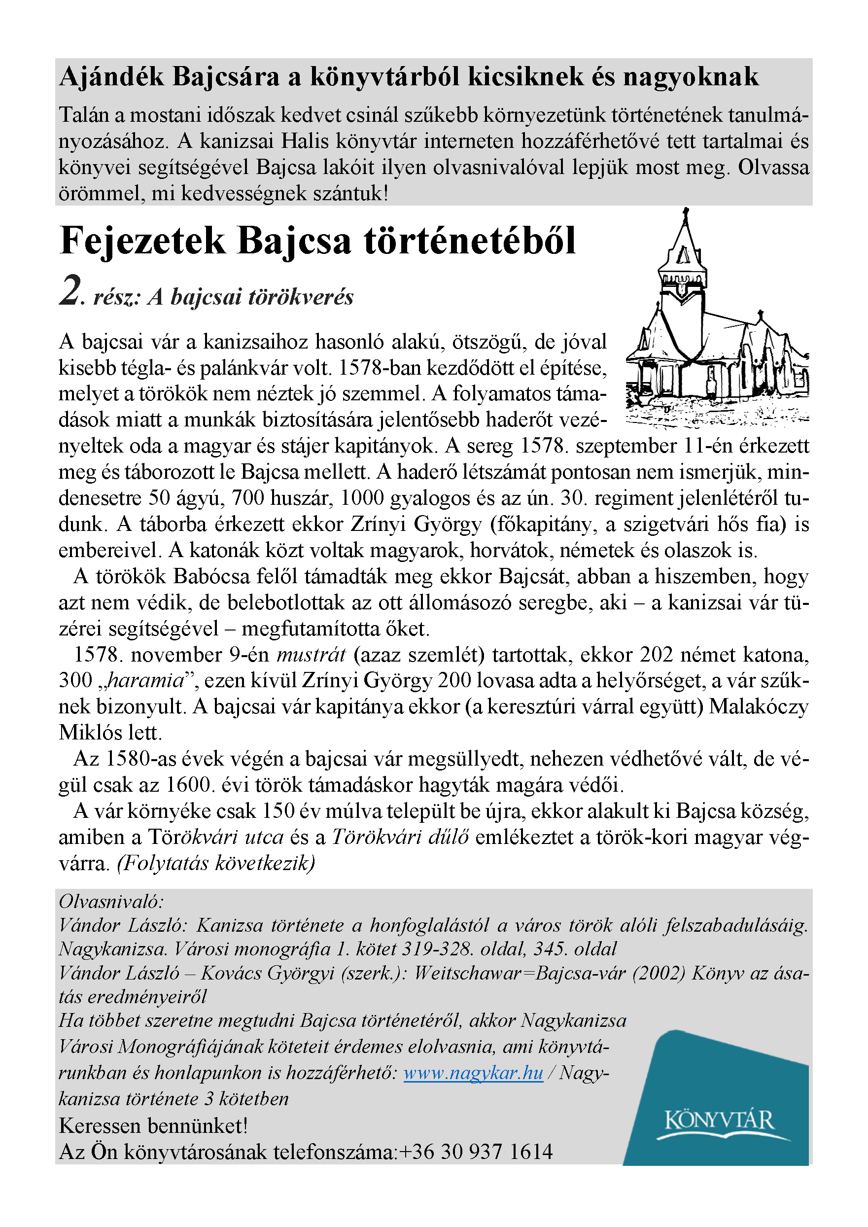 Nyilvános 1879 | 3153 | Megjelent: 2021. április 9. | Ajándék Bajcsára a könyvtárból kicsiknek és nagyoknak Talán a mostani időszak kedvet csinál szűkebb környezetünk történetének tanulmányozásához. A kanizsai Halis könyvtár interneten hozzáférhetővé tett tartalmai és könyvei segítségével Bajcsa lakóit ilyen olvasnivalóval lepjük most meg. Olvassa örömmel, mi kedvességnek szántuk! Fejezetek Bajcsa történetéből 2. rész: A bajcsai törökverés A bajcsai vár a kanizsaihoz hasonló alakú, ötszögű, de jóval kisebb tégla- és palánkvár volt. 1578-ban kezdődött el építése, melyet a törökök nem néztek jó szemmel. A folyamatos támadások miatt a munkák biztosítására jelentősebb haderőt vezényeltek oda a magyar és stájer kapitányok. A sereg 1578. szeptember 11-én érkezett meg és táborozott le Bajcsa mellett. A haderő létszámát pontosan nem ismerjük, mindenesetre 50 ágyú, 700 huszár, 1000 gyalogos és az ún. 30. regiment jelenlétéről tudunk. A táborba érkezett ekkor Zrínyi György (főkapitány, a szigetvári hős fia) is embereivel. A katonák közt voltak magyarok, horvátok, németek és olaszok is. A törökök Babócsa felől támadták meg ekkor Bajcsát, abban a hiszemben, hogy azt nem védik, de belebotlottak az ott állomásozó seregbe, aki – a kanizsai vár tüzérei segítségével – megfutamította őket. 1578. november 9-én mustrát (azaz szemlét) tartottak, ekkor 202 német katona, 300 „haramia”, ezen kívül Zrínyi György 200 lovasa adta a helyőrséget, a vár szűknek bizonyult. A bajcsai vár kapitánya ekkor (a keresztúri várral együtt) Malakóczy Miklós lett. Az 1580-as évek végén a bajcsai vár megsüllyedt, nehezen védhetővé vált, de végül csak az 1600. évi török támadáskor hagyták magára védői. A vár környéke csak 150 év múlva települt be újra, ekkor alakult ki Bajcsa község, amiben a Törökvári utca és a Törökvári dűlő emlékeztet a török-kori magyar végvárra. (Folytatás következik) Olvasnivaló: Vándor László: Kanizsa története a honfoglalástól a város török alóli felszabadulásáig. Nagykanizsa. Városi monográfia 1. kötet 319-328. oldal, 345. oldal Vándor László – Kovács Györgyi (szerk.): Weitschawar=Bajcsa-vár (2002) Könyv az ásatás eredményeiről Ha többet szeretne megtudni Bajcsa történetéről, akkor Nagykanizsa Városi Monográfiájának köteteit érdemes elolvasnia, ami könyvtá- runkban és honlapunkon is hozzáférhető: www.nagykar.hu / Nagy- kanizsa története 3 kötetben Keressen bennünket! |