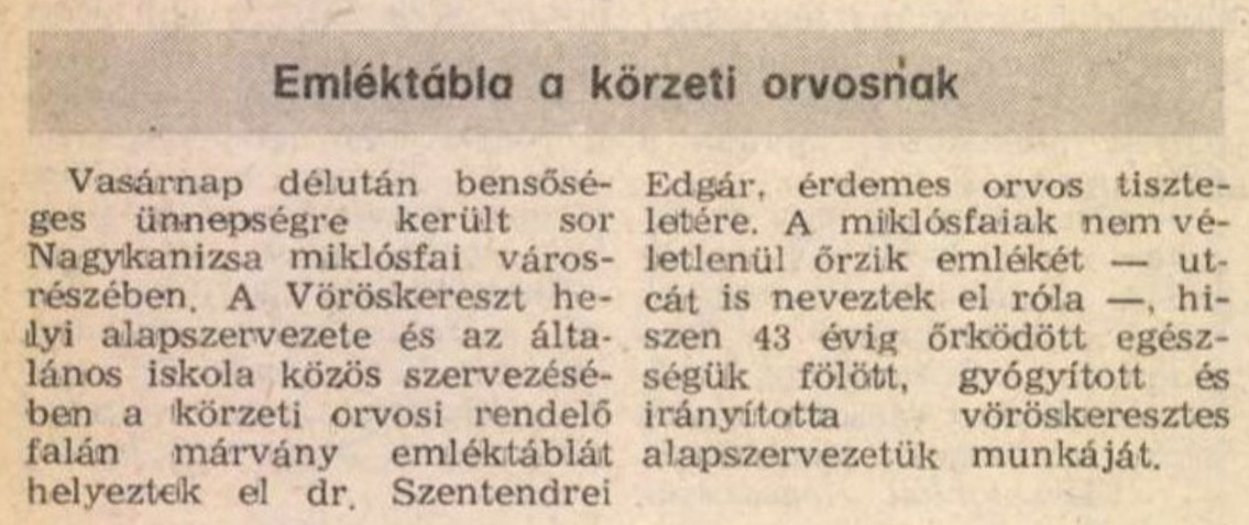 Nyilvános 1129 | 1864 | Zalai Hírlap 1986. május 12. 4. oldal | Emléktábla a körzeti orvosnak Vasárnap délután bensőséges ünnepségre került sor Nagykanizsa miklósfai városrészében. A Vöröskereszt helyi alapszervezete és az általános iskola közös szervezésében a körzeti orvosi rendelő falán márvány emléktáblát helyeztek el dr. Szentendrei Edgár, érdemes orvos tiszteletére. A miklósfaiak nem véletlenül őrzik emlékét — utcát is neveztek el róla —, hiszen 43 évig őrködött egészségük fölött, gyógyított és irányította vöröskeresztes alapszervezetük munkáját. |
