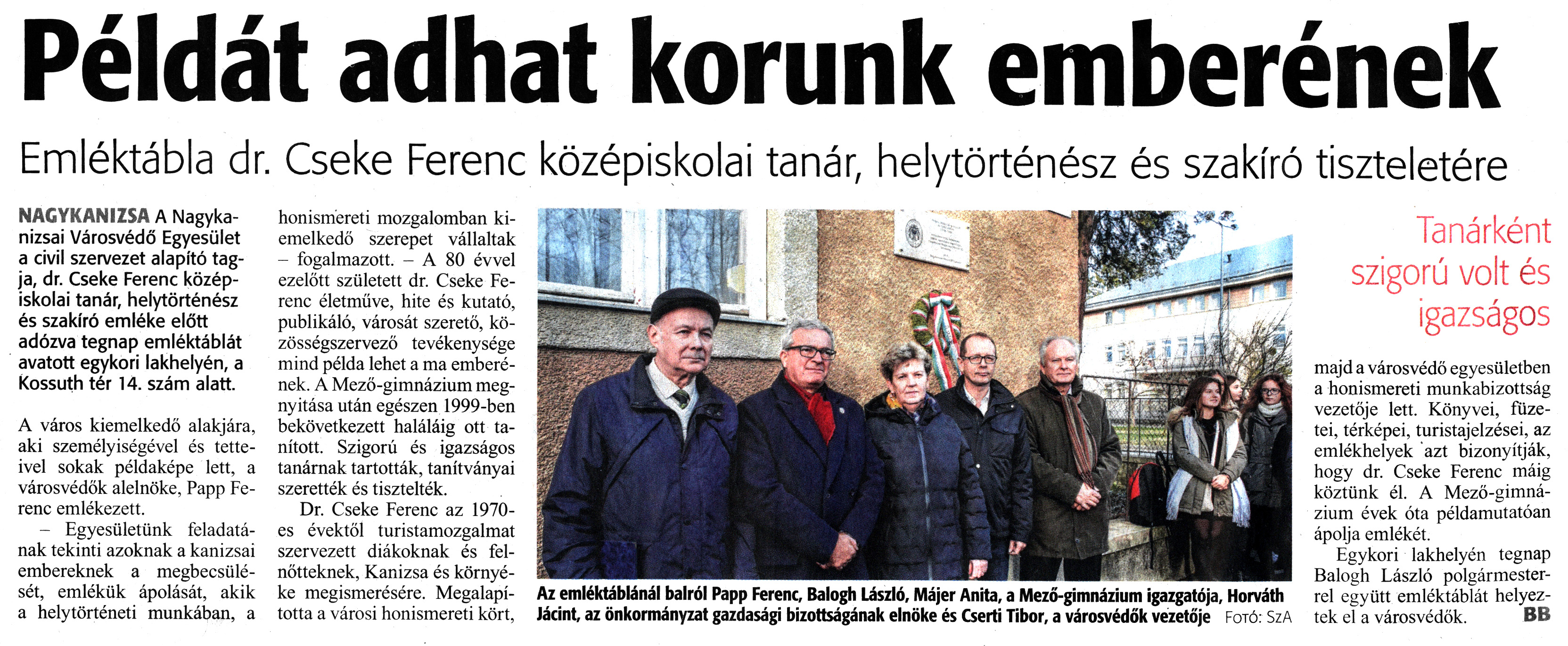 Nyilvános 992 | 1353 | Zalai Hírlap 2019. december 18. 293. szám 4. oldal | Példát adhat korunk emberének Emléktábla dr. Cseke Ferenc középiskolai tanár, helytörténész és szakíró tiszteletére NAGYKANIZSA A Nagykanizsai Városvédő Egyesület a civil szervezet alapító tagja, dr. Cseke Ferenc középiskolai tanár, helytörténész és szakíró emléke előtt adózva tegnap emléktáblát avatott egykori lakhelyén, a Kossuth tér 14. szám alatt. A város kiemelkedő alakjára, aki személyiségével és tetteivel sokak példaképe lett, a városvédők alelnöke, Papp Ferenc emlékezett. - Egyesületünk feladatának tekinti azoknak a kanizsai embereknek a megbecsülését, emlékük ápolását, akik a helytörténeti munkában, a honismereti mozgalomban kiemelkedő szerepet vállaltak - fogalmazott. - A 80 évvel ezelőtt született dr. Cseke Ferenc életműve, hite és kutató, publikáló, városát szerető, közösségszervező tevékenysége mind példa lehet a ma emberének. A Mező-gimnázium megnyitása után egészen 1999-ben bekövetkezett haláláig ott tanított. Szigorú és igazságos tanárnak tartották, tanítványai szerették és tisztelték. Dr. Cseke Ferenc az 1970-es évektől turistamozgalmat szervezett diákoknak és felnőtteknek, Kanizsa és környéke megismerésére. Megalapította a városi honismereti kört, majd a városvédő egyesületben a honismereti munkabizottság vezetője lett. Könyvei, füzetei, térképei, turistajelzései, az emlékhelyek azt bizonyítják, hogy dr. Cseke Ferenc máig köztünk él. A Mező-gimnázium évek óta példamutatóan ápolja emlékét. Egykori lakhelyén tegnap Balogh László polgármesterrel együtt emléktáblát helyeztek el a városvédők. BB Az emléktáblánál balról Papp Ferenc, Balogh László, Májer Anita, a Mező-gimnázium igazgatója, Horváth Jácint, az önkormányzat gazdasági bizottságának elnöke és Cserti Tibor, a városvédők vezetője Fotó: SzA |