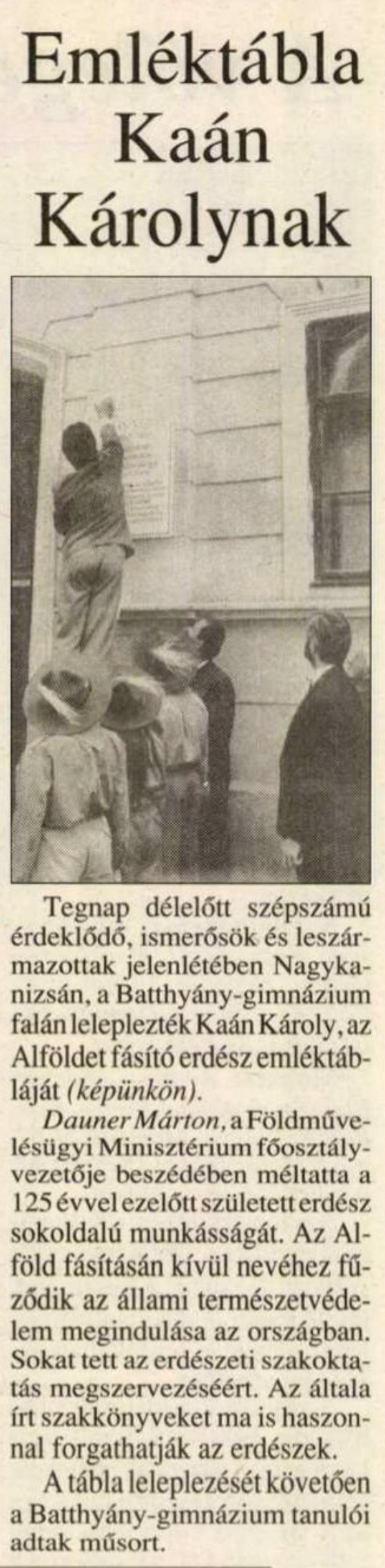 Nyilvános 1127 | 1751 | Zalai Hírlap 1992. május 23. 16. oldal | Emléktábla Kaán Károlynak Tegnap délelőtt szépszámú érdeklődő, ismerősök és leszármazottak jelenlétében Nagykanizsán, a Batthyány-gimnázium falán leleplezték Kaán Károly, az Alföldet fásító erdész emléktábláját (képünkön). Dauner Márton, a Földművelésügyi Minisztérium főosztályvezetője beszédében méltatta a 125 évvel ezelőtt született erdész sokoldalú munkásságát. Az Alföld fásításán kívül nevéhez fűződik az állami természetvédelem megindulása az országban. Sokat tett az erdészeti szakoktatás megszervezéséért. Az általa írt szakkönyveket ma is haszonnal forgathatják az erdészek. A tábla leleplezését követően a Batthyány-gimnázium tanulói adtak műsort. |