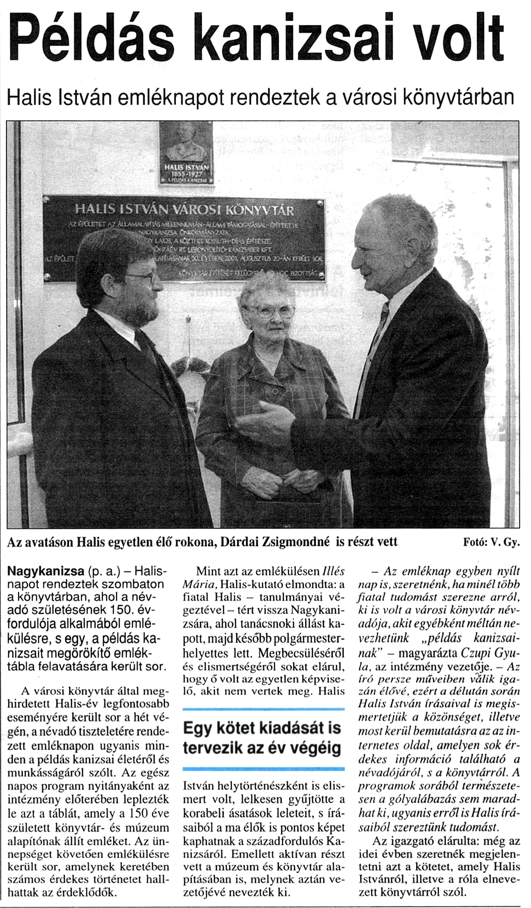 Nyilvános 567 | 855 | Zalai Hírlap 2005. szeptember 26. 5. oldal | Példás kanizsai volt Halis István emléknapot rendeztek a városi könyvtárban Az avatáson Halis egyetlen élő rokona, Dárdai Zsigmondné is részt vett Fotó: V. Gy. Nagykanizsa (p. a.) - Halis-napot rendeztek szombaton a könyvtárban, ahol a névadó születésének 150. évfordulója alkalmából emlékülésre, s egy, a példás kanizsait megörökítő emléktábla felavatására került sor. A városi könyvtár által meghirdetett Halis-év legfontosabb eseményére került sor a hét végén, a névadó tiszteletére rendezett emléknapon ugyanis minden a példás kanizsai életéről és munkásságáról szólt. Az egész napos program nyitányaként az intézmény előterében leplezték le azt a táblát, amely a 150 éve születeti könyvtár- és múzeum alapítónak állít emléket. Az ünnepséget követően emlékülésre került sor, amelynek keretében számos érdekes történetet hallhattak az érdeklődők. Mint azt az emlékülésen Illés Mária. Halis-kutató elmondta: a fiatal Halis - tanulmányai végeztével - tért vissza Nagykanizsára, ahol tanácsnoki állást kapott, majd később polgármester-helyettes lett. Megbecsüléséről és elismertségéről sokat elárul, hogy ő volt az egyetlen képviselő, akit nem vertek meg. Halis István helytörténészként is elismert volt, lelkesen gyűjtötte a korabeli ásatások leleteit, s írásaiból a ma élők is pontos képet kaphatnak a századfordulós Kanizsáról. Emellett aktívan részt vett a múzeum és könyvtár alapításában is, melynek aztán vezetőjévé nevezték ki. - Az emléknap egyben nyílt nap is, szeretnénk, ha minél több fiatal tudomást szerezne arról, ki is volt a városi könyvtár névadója, akit egyébként méltán nevezhetünk „példás kanizsainak" - magyarázta Czupi Gyula, az intézmény vezetője. - Az író persze műveiben válik igazán élővé, ezért a délután során Halis István írásaival is megismertetjük a közönséget, illetve most kerül bemutatásra az az internetes oldal, amelyen sok érdekes információ található a névadójáról, s a könyvtárról. A programok sorából természetesen a gólyalábazás sem maradhat ki, ugyanis erről is Halis írásaiból szereztünk tudomást. Az igazgató elárulta: még az idei évben szeretnék megjelentetni azt a kötetei, amely Halis Istvánról, illetve a róla elnevezett könyvtárról szól. |